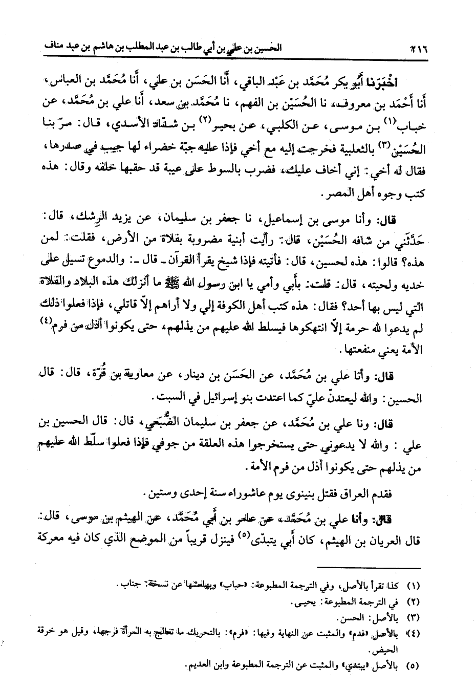 أخبرنا أبو بكر محمد بن عبد الباقي أنا الحسن بن علي أنا محمد بن العباس أنا أحمد بن معروف نا الحسين بن الفهم نا محمد بن سعد أنا علي بن محمد عن خباب (1) بن موسى عن الكلبي عن بحير (2) بن شداد الأسدي قال مر بنا الحسين (3) بالثعلبية فخرجت إليه مع أخي فإذا عليه جبة خضراء لها جيب في صدرها فقال له أخي إني أخاف عليك فضرب بالسوط على عيبة قد حقبها خلفه وقال هذه كتب وجوه أهل المصر قال وأنا موسى بن إسماعيل نا جعفر بن سليمان عن يزيد الرشك قال حدثني من شافه الحسين قال رأيت أبنية مضروبة بفلاة من الأرض فقلت لمن هذه قالوا هذه لحسين قال فأتيته فإذا شيخ يقرأ القرآن قال والدموع تسيل على خديه ولحيته قال قلت بأبي وأمي يا ابن رسول الله (صلى الله عليه وسلم) ما أنزلك هذه البلاد والفلاة التي ليس بها أحد فقال هذه كتب أهل الكوفة إلي ولا أراهم إلا قاتلي فإذا فعلوا ذلك لم يدعوا لله حرمة إلا انتهكوها فيسلط الله عليهم من يذلهم حتى يكونوا أذل من فرم (4) الأمة يعني منفعتها قال وأنا علي بن محمد عن الحسن بن دينار عن معاوية بن قرة قال قال الحسين والله ليعتدن علي كما اعتدت بنو إسرائيل في السبت قال ونا علي بن محمد عن جعفر بن سليمان الضبعي قال قال الحسين بن علي والله لا يدعوني حتى يستخرجوا هذه العلقة من جوفي فإذا فعلوا سلط الله عليهم من يذلهم حتى يكونوا أذل من فرم الأمة فقدم العراق فقتل بنينوى يوم عاشوراء سنة إحدى وستين قال وأنا علي بن محمد عن عامر بن أبي محمد عن الهيثم بن موسى قال قال العريان بن الهيثم كان أبي يتبدى (5) فينزل قريبا من الموضع الذي كان فيه معركة