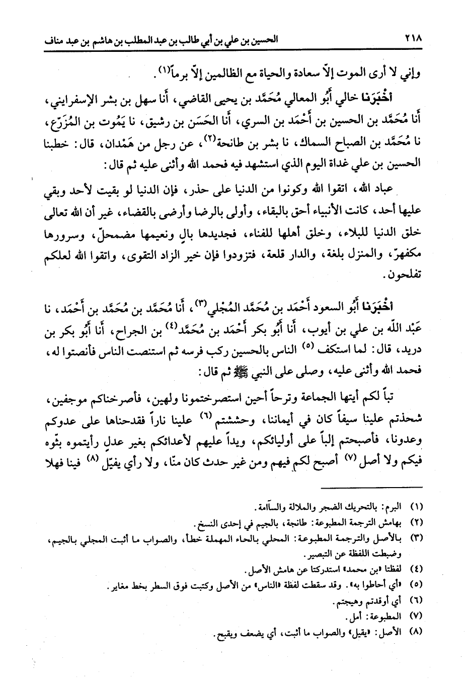 وإني لا أرى الموت إلا سعادة والحياة مع الظالمين إلا برما (1) أخبرنا خالي أبو المعالي محمد بن يحيى القاضي أنا سهل بن بشر الإسفراييني أنا محمد بن الحسين بن أحمد بن السري أنا الحسين بن رشيق نا يموت بن المزرع نا محمد بن الصباح السماك نا بشر بن طانحة (2) عن رجل من همدان قال خطبنا الحسين بن علي غداة اليوم الذي استشهد فيه فحمد الله وأثنى عليه ثم قال عباد الله اتقوا الله وكونوا من الدنيا على حذر فإن الدنيا لو بقيت لأحد وبقي عليها أحد كانت الأنبياء أحق بالبقاء وأولى بالرضا وأرضى بالقضاء غير أن الله تعالى خلق الدنيا للبلاء وخلق أهلها للفناء فجديدها بال ونعيمها مضمحل وسرورها مكفهر والمنزل بلغة والدار قلعة فتزودوا فإن خير الزاد التقوى واتقوا الله لعلكم تفلحون أخبرنا أبو السعود أحمد بن محمد المجلي (3) أنا محمد بن محمد بن أحمد نا عبد الله بن علي بن أيوب أنا أبو بكر أحمد بن محمد (4) بن الجراح أنا أبو بكر بن دريد قال لما استكف (5) الناس بالحسين ركب فرسه ثم استنصت الناس فانصتوا له فحمد الله وأثنى عليه وصلى على النبي (صلى الله عليه وسلم) ثم قال تبا لكم أيتها الجماعة وترحا أحين استصرختمونا ولهين فأصرخناكم موجفين شحذتم علينا سيفا كان في أيماننا وحششتم (6) علينا نارا فقدحناها على عدوكم وعدونا فأصبحتم إلبا على أوليائكم ويدا عليهم لأعدائكم بغير عدل رأيتموه بثوه فيكم ولا أصل (7) أصبح لكم فيهم ومن غير حدث كان منا ولا رأي يفيل (8) فينا فهلا