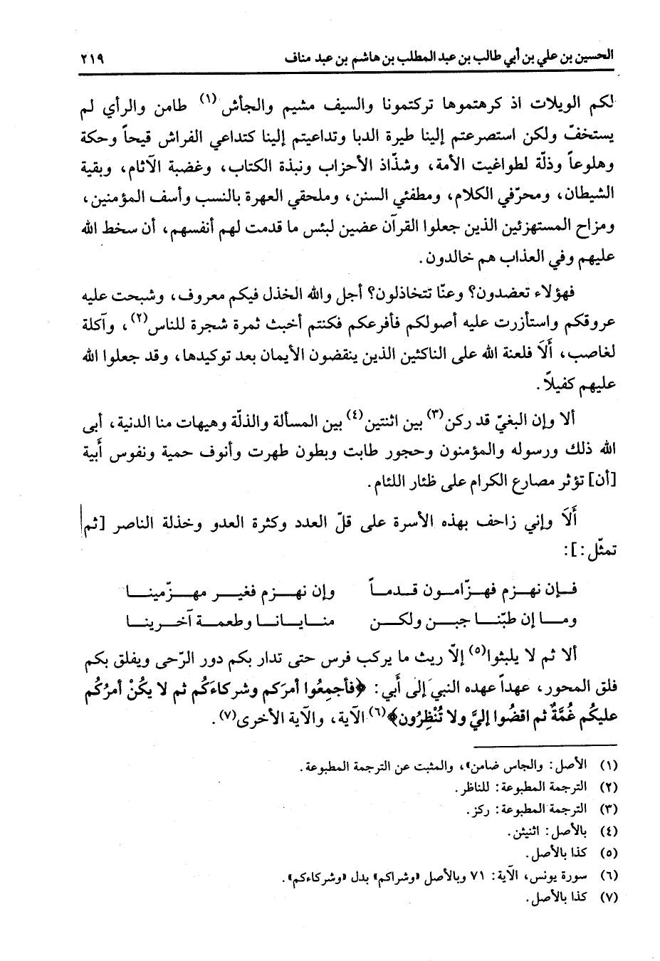 لكم الويلات إذا كرهتموها تركتمونا والسيف مشيم والجأش (1) طامن والرأي لم يستخف ولكن استصرعتم إلينا طيرة الدبا وتداعيتم إلينا كتداعي الفراش قيحا وحكة وهلوعا وذلة لطواغيت الأمة وشذاذ الأحزاب ونبذة الكتاب وغضبة الآثام وبقية الشيطان ومحرفي الكلام ومطفئي السنن وملحقي العهرة بالنسب وأسف المؤمنين ومزاح المستهزئين الذين جعلوا القرآن عضين لبئس ما قدمت لهم أنفسهم أن سخط الله عليهم وفي العذاب هم خالدون فهؤلاء تعضدون وعنا تتخاذلون أجل والله الخذل فيكم معروف وشبحت عليه عروقكم واستأزرت عليه أصولكم فأفرعكم فكنتم أخبث ثمرة شجرة للناس (2) وآكلة لغاصب ألا فلعنة الله على الناكثين الذين ينقضون الأيمان بعد توكيدها وقد جعلوا الله عليهم كفيلا ألا وإن البغي قد ركن (3) بين اثنتين (4) بين المسألة والذلة وهيهات منا الدنية أبى الله ذلك ورسوله والمؤمنون وحجور طابت وبطون وأنوف حمية ونفوس أبية أن تؤثر مصارع الكرام على ظئار اللئام ألا وإني زاحف بهذه الأسرة على قل العدد وكثرة العدو وخذلة الناصر ثم تمثل فإن نهزم فهزامون قدما * وإن نهزم فغير مهزمينا وما إن طبنا جبن ولكن * منايانا وطعمة آخرينا ألا ثم لا لبثوا (5) إلا ريث ما يركب فرس حتى تدار بكم دور الرحى ويفلق بكم فلق المحور عهدا عهده النبي إلى أبي " فأجمعوا أمركم وشركاءكم ثم لا يكن أمركم عليكم غمة ثم اقضوا إلي ولا تنظرون " (6) الآية والآية الأخرى (7)