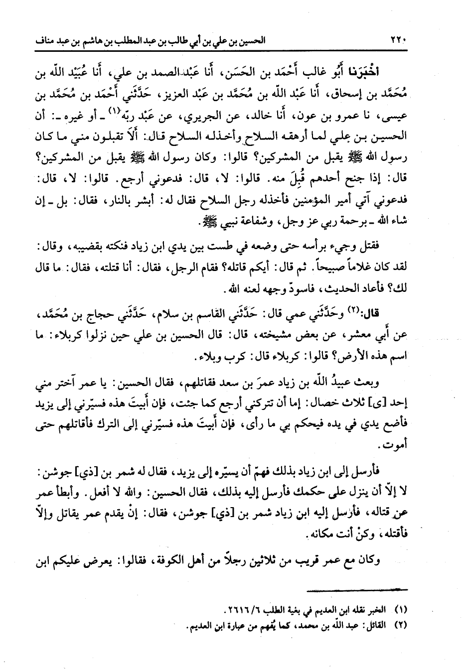 أخبرنا أبو غالب أحمد بن الحسن أنا عبد الصمد بن علي أنا عبيد الله بن محمد بن إسحاق أنا عبد الله بن محمد بن عبد العزيز حدثني أحمد بن محمد بن عيسى نا عمرو بن عون أنا خالد عن الجريري عن عبد ربه (1) - أو غيره أن الحسين بن علي لما أرهقه السلاح وأخذله السلاح قال ألا تقبلون مني ما كان رسول الله (صلى الله عليه وسلم) يقبل من المشركين قالوا وكان رسول الله (صلى الله عليه وسلم) يقبل من المشركين قال إذا جنح أحدهم قبل منه قالوا لا قال فدعوني أرجع قالوا لا قال فدعوني آتي أمير المؤمنين فأخذ له رجل السلاح فقال له أبشر بالنار فقال بل إن شاء الله برحمة ربي عز وجل وشفاعة نبيي (صلى الله عليه وسلم) فقتل وجئ برأسه حتى وضعه في طست بين يدي ابن زياد فنكته بقضيبه وقال لقد كان غلاما صبيحا ثم قال أيكم قاتله فقام الرجل فقال أنا قتلته فقال ما قال لك فأعاد الحديث فاسود وجهه لعنه الله قال (2) وحدثني عمي قال حدثني القاسم بن سلام حدثني حجاج بن محمد عن أبي معشر عن بعض مشيخته قال قال الحسين بن علي حين نزلوا كربلاء ما اسم هذه الأرض قالوا كربلاء قال كرب وبلاء وبعث عبيد الله بن زياد عمر بن سعد فقاتلهم فقال الحسين يا عمر آختر مني إحدى ثلاث خصال إما أن تتركني أرجع كما جئت فإن أبيت هذه فسيرني إلى يزيد فأضع يدي في يده فيحكم بي ما رأى فإن أبيت هذه فسيرني إلى الترك فأقاتلهم حتى أموت فأرسل إلى ابن زياد بذلك فهم أن يسيره إلى يزيد فقال له شمر بن ذي جوشن لا إلا أن ينزل على حكمك فأرسل إليه بذلك فقال الحسين والله لا أفعل وأبطأ عمر عن قتاله فأرسل إليه ابن زياد شمر بن ذي جوشن فقال إن يقدم عمر يقاتل وإلا فأقتله وكن أنت مكانه وكان مع عمر قريب من ثلاثين رجلا من أهل الكوفة فقالوا يعرض عليكم ابن