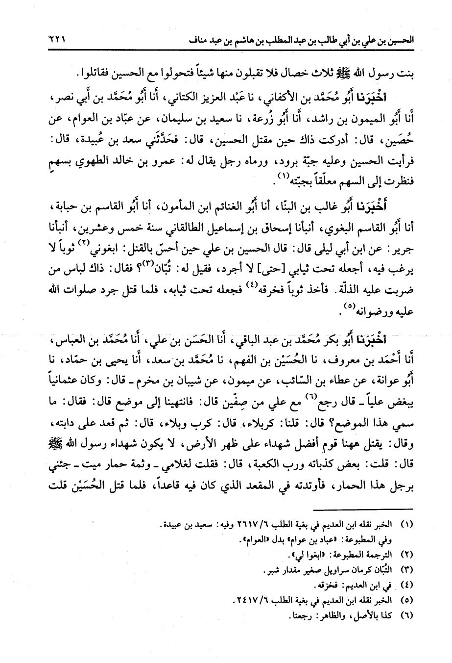 بنت رسو الله (صلى الله عليه وسلم) ثلاث خصال فلا تقبلون منها شيئا فتحولوا مع الحسين فقاتلوا أخبرنا أبو محمد بن الأكفاني نا عبد العزيز الكتاني أنا أبو محمد بن أبي نصر أنا أبو الميمون بن راشد أنا أبو زرعة نا سعيد بن سليمان عن عباد بن العوام عن حصين قال أدركت ذاك حين مقتل الحسين قال فحدثني سعد بن عبيدة قال فرأيت الحسين وعليه جبة برود ورماه رجل يقال له عمرو بن خالد الطهوي بسهم فنظرت إلى السهم معلقا بجبته (1) أخبرنا أبو غالب بن البنا أنا أبو الغنائم ابن المأمون أنا أبو القاسم بن حبابة أنا أبو القاسم البغوي أنبأنا إسحاق بن إسماعيل الطالقاني سنة خمس وعشرين أنبأنا جرير عن ابن أبي ليلى قال قال الحسين بن علي حين أحس بالقتل ابغوني (2) ثوبا لا يرغب فيه أجعله تحت ثيابي حتى لأجرد أجرد فقيل له تبان (3) فقال ذاك لباس من ضربت عليه الذلة فأخذ ثوبا فخرقه (4) فجعله تحت ثيابه فلما قتل جرد صلوات الله عليه ورضوانه (5) أخبرنا أبو بكر محمد بن عبد الباقي أنا الحسن بن علي أنا محمد بن العباس أنا أحمد بن معروف نا الحسين بن الفهم نا محمد بن سعد أنا يحيى بن حماد نا أبو عوانة عن عطاء بن السائب عن ميمون عن شيبان بن مخرم قال وكان عثمانيا يبغض عليا قال رجع (6) مع علي من صفين قال فانتهينا إلى موضع قال فقال ما سمي هذا الموضع قال قلنا كربلاء قال كرب وبلاء قال ثم قعد على دابته وقال يقتل ههنا قوم افضل شهداء على ظهر الأرض لا يكون شهداء رسول الله (صلى الله عليه وسلم) قال قلت بعض كذباته ورب الكعبة قال فقلت لغلامي وثمة حمار ميت جئني برجل هذا الحمار فأوتدته في المقعد الذي كان فيه قاعدا فلما قتل الحسين قلت