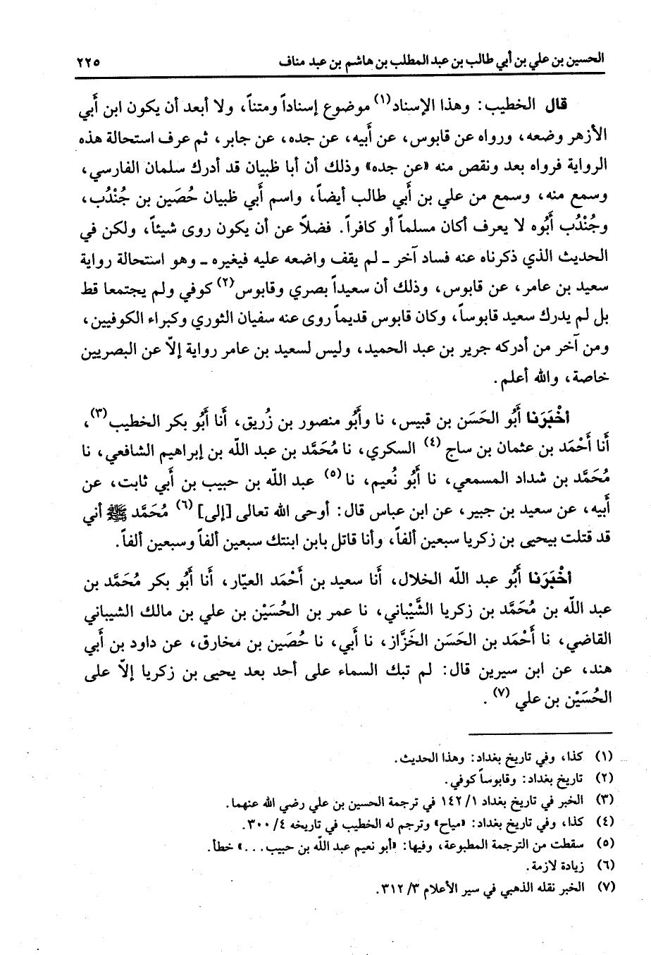 قال الخطيب وهذا الإسناد (1) موضوع إسنادا ومتنا ولا أبعد أن يكون ابن أبي الأزهر وضعه ورواه عن قابوس عن أبيه عن جده عن جابر ثم عرف استحالة هذه الرواية فرواه بعد ونقص منه عن جده وذلك أن أبا ظبيان قد أدرك سلمان الفارسي وسمع منه وسمع من علي بن أبي طالب أيضا واسم أبي ظبيان حصين بن جندب وجندب أبوه لا يعرف أكان مسلما أو كافرا فضلا عن أن يكون روى شيئا ولكن في الحديث الذي ذكرناه عنه فساد آخر لم يقف واضعه عليه فيغيره وهو استحالة رواية سعيد بن عامر عن قابوس وذلك أن سعيد ابصري وقابوس (2) كوفي ولم يجتمعا قط بل لم يدرك سعيد قابوسا وكان قابوس قديما روى عنه سفيان الثوري وكبراء الكوفيين ومن آخر من أدركه جرير بن عبد الحميد وليس لسعيد بن عامر رواية إلا عن البصريين خاصة والله أعلم أخبرنا أبو الحسن بن قبيس نا وأبو منصور بن زريق أنا أبو بكر الخطيب (3) أنا احمد بن عثمان بن ساج (4) السكري نا محمد بن عبد الله بن إبراهيم الشافعي نا محمد بن شداد المسمعي نا أبو نعيم نا (5) عبد الله بن حبيب بن أبي ثابت عن أبيه عن سعيد بن جبير عن ابن عباس قال أوحى الله تعالى إلى (6) محمد (صلى الله عليه وسلم) أني قد قتلت بيحيى بن زكريا سبعين ألفا وأنا قاتل بابن ابنتك سبعين ألفا وسبعين ألفا أخبرنا أبو عبد الله الخلال أنا سعيد بن أحمد العيار أنا أبو بكر محمد بن عبد الله بن محمد بن زكريا الشيباني نا عمر بن الحسين بن علي بن مالك الشيباني القاضي نا أحمد بن الحسن الخزاز نا أبي نا حصين بن مخارق عن داود بن أبي هند عن ابن سيرين قال لم تبك السماء على أحد بعد يحيى بن زكريا إلا على الحسين بن علي (7)