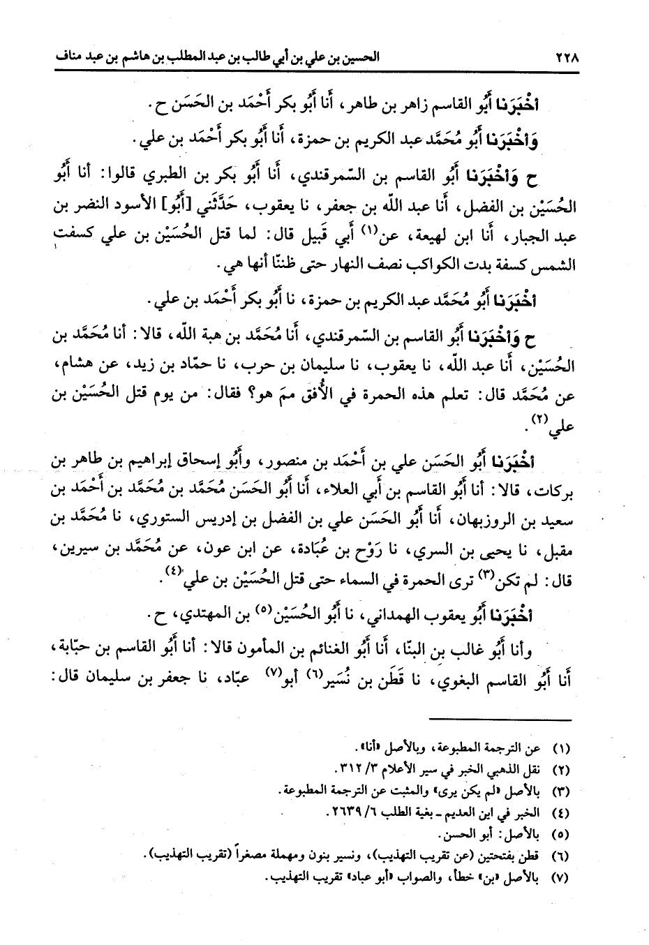 أخبرنا أبو القاسم زاهر بن طاهر أنا أبو بكر أحمد بن الحسن ح وأخبرنا أبو محمد عبد الكريم بن حمزة أنا أبو بكر أحمد بن علي ح وأخبرنا أبو القاسم بن السمرقندي أنا أبو بكر بن الطبري قالوا أنا أبو الحسين بن الفضل أنا عبد الله بن جعفر نا يعقوب حدثني أبو الأسود النضر بن عبد الجبار أنا ابن لهيعة عن (1) أبي قبيل قال لما قتل الحسين بن علي كسفت الشمس كسفة بدت الكواكب نصف النهار حتى ظننا أنها هي أخبرنا أبو محمد عبد الكريم بن حمزة نا أبو بكر أحمد بن علي ح وأخبرنا أبو القاسم بن السمرقندي أنا محمد بن هبة الله قالا أنا محمد بن الحسين أنا عبد الله نا يعقوب نا سليمان بن حرب نا حماد بن زيد عن هشام عن محمد قال تعلم هذه الحمرة في الأفق مم هو فقال من يوم قتل الحسين بن علي (2) أخبرنا أبو الحسن علي بن أحمد بن منصور وأبو إسحاق إبراهيم بن طاهر بن بركات قالا أنا أبو القاسم بن أبي العلاء أنا أبو الحسن محمد بن محمد بن أحمد بن سعيد بن الروزبهان أنا أبو الحسن علي بن الفضل بن إدريس الستوري نا محمد بن مقبل نا يحيى بن السري نا روح بن عبادة عن ابن عون عن محمد بن سيرين قال لم تكن (3) ترى الحمرة في السماء حتى قتل الحسين بن علي (4) أخبرنا أبو يعقوب الهمداني نا أبو الحسين (5) بن المهتدي ح وأنا أبو غالب بن البنا أنا أبو الغنائم بن المأمون قالا أنا أبو القاسم بن حبابة أنا أبو القاسم البغوي نا قطن بن نسير (6) أبو (7) عباد نا جعفر بن سليمان قال