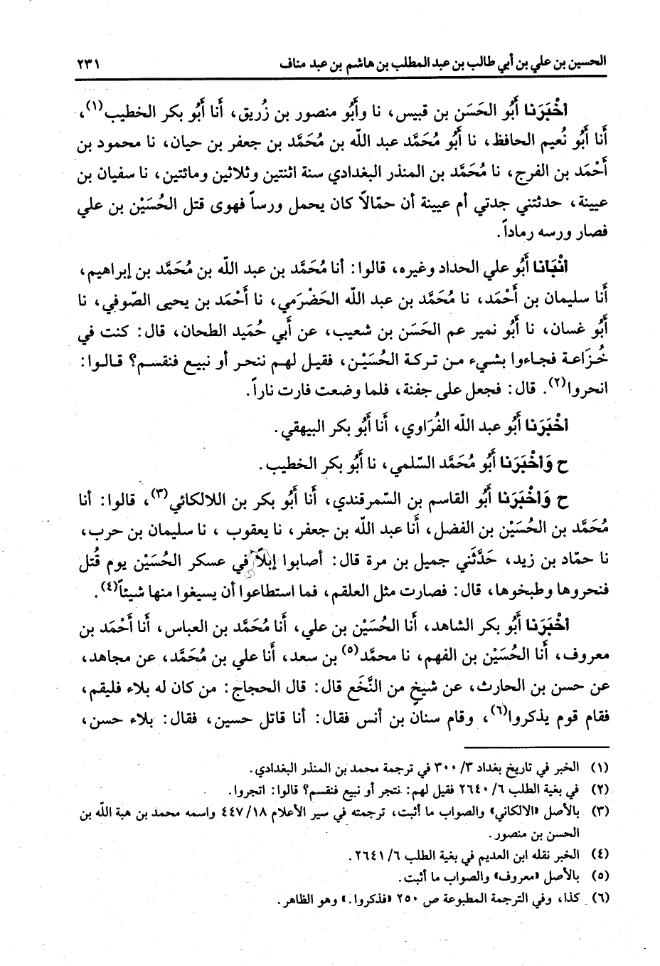أخبرنا أبو الحسن بن قبيس نا وأبو منصور بن زريق أنا أبو بكر الخطيب (1) أنا أبو نعيم الحافظ نا أبو محمد عبد الله بن محمد بن جعفر بن حيان نا محمود بن أحمد بن الفرج نا محمد بن المنذر البغدادي سنة اثنتين وثلاثين ومائتين نا سفيان بن عيينة حدثتني جدتي أم عيينة أن حمالا كان يحمل ورسا فهوى قتل الحسين بن علي فصار ورسه رمادا أنبأنا أبو علي الحداد وغيره قالوا أنا محمد بن عبد الله بن محمد بن إبراهيم أنا سليمان بن أحمد نا محمد بن عبد الله الحضرمي نا أحمد بن يحيى الصوفي نا أبو غسان نا أبو نمير عم الحسن بن شعيب عن أبي حميد الطحان قال كنت في خزاعة فجاءوا بشئ من تركة الحسين فقيل لهم ننحر أو نبيع فنقسم قالوا انحروا (2) قال فجعل على جفنة فلما وضعت فارت نارا أخبرنا أبو عبد الله الفراوي أنا أبو بكر البيهقي ح وأخبرنا أبو محمد السلمي نا أبو بكر الخطيب ح وأخبرنا أبو القاسم بن السمرقندي أنا أبو بكر اللالكائي (3) قالوا أنا محمد بن الحسين بن الفضل أنا عبد الله بن جعفر نا يعقوب نا سليمان بن حرب نا حماد بن زيد حدثني جميل بن مرة قال أصابوا إبلا في عسكر الحسين يوم قتل فنحروها وطبخوها قال فصارت مثل العلقم فما استطاعوا أن يسيغوا منها شيئا (4) أخبرنا أبو بكر الشاهد أنا الحسين بن علي أنا محمد بن العباس أنا أحمد بن معروف أنا الحسين بن الفهم نا محمد (5) بن سعد أنا علي بن محمد عن مجاهد عن حسن بن الحارث عن شيخ من النخع قال الحجاج من كان له بلاء فليقم فقام قوم يذكروا (6) وقام سنان بن أنس فقال أنا قاتل حسين فقال بلاء حسن