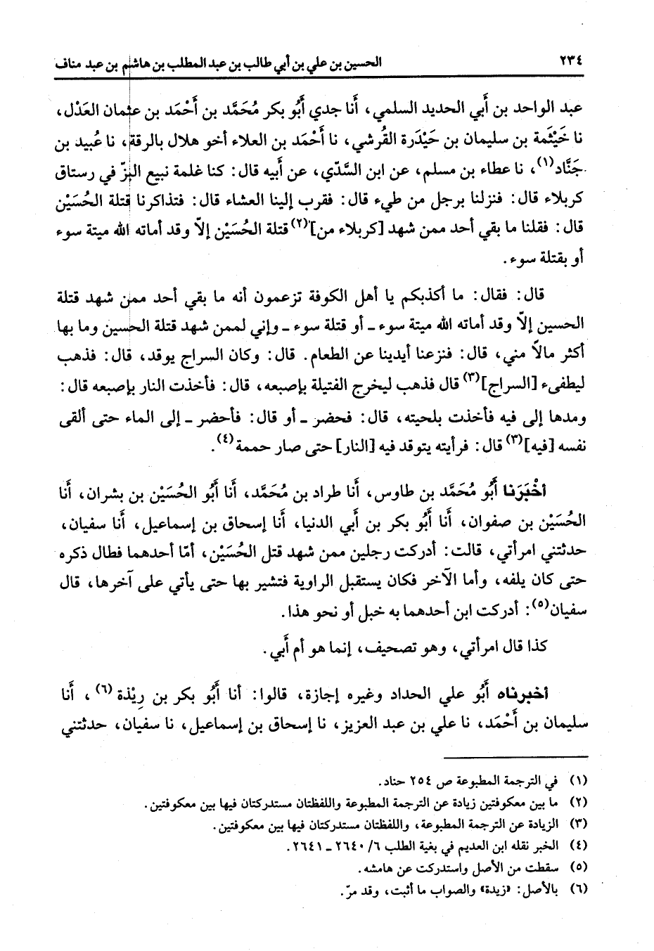 عبد الواحد بن أبي الحديد السلمي أنا جدي أبو بكر محمد بن أحمد بن عثمان العدل نا خيثمة بن سليمان بن حيدرة القرشي نا أحمد بن العلاء أخو هلال بالرقة نا عبيد بن جناد (1) نا عطاء بن مسلم عن ابن السدي عن أبيه قال كنا غلمة نبيع البز في رستاق كربلاء قال فنزلنا برجل من طئ قال فقرب إلينا العشاء قال فتذاكرنا قتلة الحسين قال فقلنا ما بقي أحد ممن شهد كربلاء من (2) قتلة الحسين إلا وقد أماته الله ميتة سوء أو بقتلة سوء قال فقال ما أكذبكم يا أهل الكوفة تزعمون أنه ما بقي أحد ممن شهد قتلة الحسين إلا وقد أماته الله ميتة سوء أو قتلة سوء وإني لممن شهد قتلة الحسين وما بها أكثر مالا مني قال فنزعنا أيدينا عن الطعام قال وكان السراج يوقد قال فذهب ليطفئ السراج (3) قال فذهب ليخرج الفتيلة بإصبعه قال فأخذت النار بإصبعه قال ومدها إلى فيه فأخذت بلحيته قال فحضر أو قال فأحضر إلى الماء حتى ألقى نفسه فيه (3) قال فرأيته يتوقد فيه النار حتى صار حممة (4) أخبرنا أبو محمد بن طاوس أنا طراد بن محمد أنا أبو الحسين بن بشران أنا الحسين بن صفوان أنا أبو بكر بن أبي الدنيا أنا إسحاق بن إسماعيل أنا سفيان حدثتني امرأتي قالت أدركت رجلين ممن شهد قتل الحسين أما أحدهما فطال ذكره حتى كان يلفه وأما الآخر فكان يستقبل الراوية فتشير بها حتى يأتي على آخرها قال سفيان (5) أدركت ابن أحدهما به خبل أو نحو هذا كذا قال امرأتي وهو تصحيف إنما هو أم أبي أخبرناه أبو علي الحداد وغيره إجازة قالوا أنا أبو بكر بن ريذة (6) أنا سليمان بن أحمد نا علي بن عبد العزيز نا إسحاق بن إسماعيل نا سفيان حدثتني