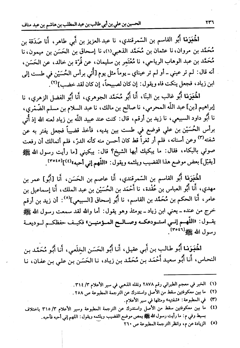 أخبرنا أبو القاسم بن السمرقندي نا عبد العزيز بن أبي طاهر أنا صدقة بن محمد بن مروان نا عثمان بن محمد الذهبي (1) نا إسحاق بن الحسن بن ميمون نا محمد بن عبد الوهاب الرياحي نا معتمر بن سليمان عن قرة بن خالد عن الحسن أنه قال لم تر عيني أو لم تر عيناي يوما مثل يوم أتي برأس الحسين في طست إلى ابن زياد فجعل ينكت فاه ويقول إن كان لصبيحا إن كان لقد خضب (2) أخبرنا أبو غالب بن البنا أنا أبو محمد الجوهري أنا أبو الفضل الزهري نا إبراهيم بن عبد الله المحرمي نا صالح بن مالك نا عبد السلام بن مسلم الضمري نا أبو داود السبيعي نا زيد بن أرقم قال كنت عند عبيد الله بن زياد لعنه الله إذ أتي برأس الحسين بن علي فوضع في طست بين يديه فأخذ قضيبا فجعل يفتر به عن شفته (3) وعن أسنانه فلم أر ثغرا قط كان أحسن منه كأنه الدر فلم أتمالك أن رفعت صوتي بالبكاء فقال ما يبكيك أيها الشيخ قال يبكيني ما رأيت رسول الله (صلى الله عليه وسلم) يقبل بعض موضع هذا القضيب ويلثمه ويقول اللهم إني أحبه) (4) ]