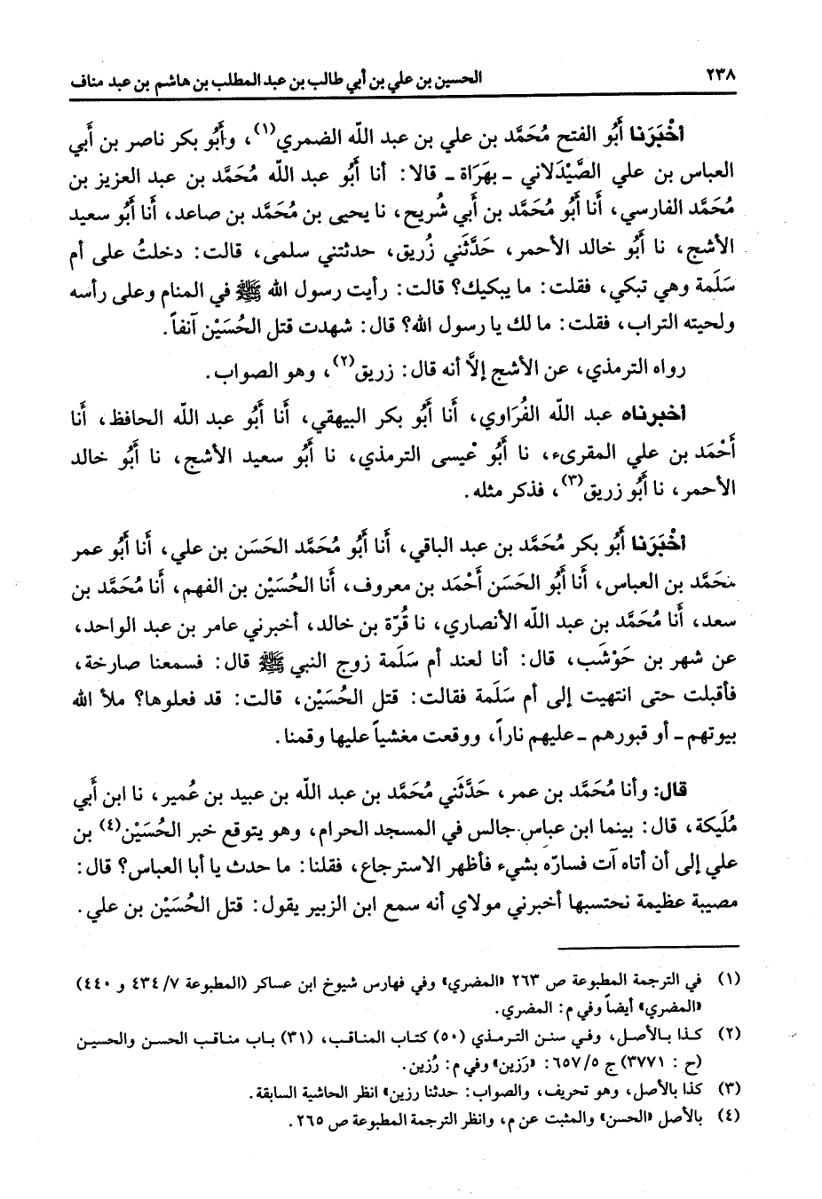 أخبرنا أبو الفتح محمد بن علي بن عبد الله الضمري (1) وأبو بكر ناصر بن أبي العباس بن علي الصيدلاني بهراة قالا أنا أبو عبد الله محمد بن عبد العزيز بن محمد الفارسي أنا أبو محمد بن أبي شريح نا يحيى بن محمد بن صاعد أنا أبو سعيد الأشج نا أبو خالد الأحمر حدثني زريق حدثتني سلمى قالت دخلت على أم سلمة وهي تبكي فقلت ما يبكيك قالت رأيت رسول الله (صلى الله عليه وسلم) في المنام وعلى رأسه ولحيته التراب فقلت مالك يا رسول الله قال شهدت قتل الحسين آنفا رواه الترمذي عن الأشج إلا انه قال زريق (2) وهو الصواب أخبرناه عبد الله الفراوي أنا أبو بكر البيهقي أنا أبو عبد الله الحافظ أنا أحمد بن علي المقرئ نا أبو عيسى الترمذي نا أبو سعيد الأشج نا أبو خالد الأحمر نا أبو زريق (3) فذكر مثله أخبرنا أبو بكر محمد بن عبد الباقي أنا أبو محمد الحسن بن علي أنا أبو عمر محمد بن العباس أنا أبو الحسن أحمد بن معروف أنا الحسين بن الفهم أنا محمد بن سعد أنا محمد بن عبد الله الأنصاري نا قرة بن خالد أخبرني عامر بن عبد الواحد عن شهر بن حوشب قال أنا لعند أم سلمة زوج النبي (صلى الله عليه وسلم) قال فسمعنا صارخة فأقبلت حتى انتهيت إلى أم سلمة فقالت قتل الحسين قالت قد فعلوها ملأ الله بيوتهم أو قبورهم عليهم نارا ووقعت مغشيا عليها وقمنا قال وأنا محمد بن عمر حدثني محمد بن عبد الله بن عبيد بن عمير نا ابن أبي مليكة قال بينما ابن عباس جالس في المسجد الحرام وهو يتوقع خبر الحسين (4) بن علي إلى أن أتاه آت فساره بشئ فأظهر الاسترجاع فقلنا ما حدث يا أبا العباس قال مصيبة عظيمة نحتسبها أخبرني مولاي أنه سمع ابن الزبير يقول قتل الحسين بن علي