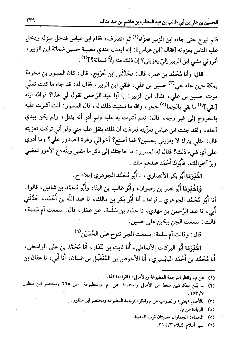 فلم نبرح حتى جاءه ابن الزبير فعزاه (1) ثم انصرف فقام ابن عباس فدخل منزله ودخل عليه الناس يعزونه فقال ابن عباس إنه ليعدل عندي مصيبة حسين شماتة ابن الزبير أتروني مشي ابن الزبير إلي يعزيني إن ذلك منه إلا شماتة (2) قال وأنا محمد بن عمر قال فحدثني ابن جريج قال كان المسور بن مخرمة بمكة حين جاء نعي (3) حسين بن علي فلقي ابن الزبير فقال له قد جاء ما كنت تمني موت حسين بن علي فقال ابن الزبير يا أبا عبد الرحمن تقول لي هذا فو الله ليته بقي ما بقي (4) بالجما (5) حجر والله ما تمنيت ذلك له قال المسور أنت أشرت عليه بالخروج إلى غير وجه قال نعم أشرت به عليه ولم أدر أنه يقتل ولم يكن بيدي أجله ولقد جئت ابن عباس فعزيته فعرفت أن ذلك يثقل عليه مني ولو أني تركت تعزيته قال مثلي يترك لا يعزيني بحسين فما أصنع أخوالي وغرة الصدور علي وما أدري على أي شئ ذلك فقال له المسور ما حاجتك إلى ذكر ما مضى وبثه دع الأمور تمضي وبر أخوالك فأبوك أحمد عندهم منك أخبرنا أبو بكر الأنصاري نا أبو محمد الجوهري إملاء ح وأخبرنا أبو نصر بن رضوان وأبو غالب بن البنا وأبو محمد بن شاتيل قالوا أنا أبو محمد الجوهري قراءة أنا أبو بكر بن مالك نا عبد الله بن أحمد حدثني أبي نا عبد الرحمن بن مهدي نا حماد بن سلمة عن عمار قال سمعت أم سلمة قالت سمعت الجن يبكين على حسين قال وقالت أم سلمة سمعت الجن تنوح على الحسين (6) أخبرنا أبو البركات الأنماطي أنا ثابت بن بندار أنا محمد بن علي الواسطي أنا محمد بن أحمد البابسيري أنا الأحوص بن المفضل بن غسان أنا أبي نا عفان بن