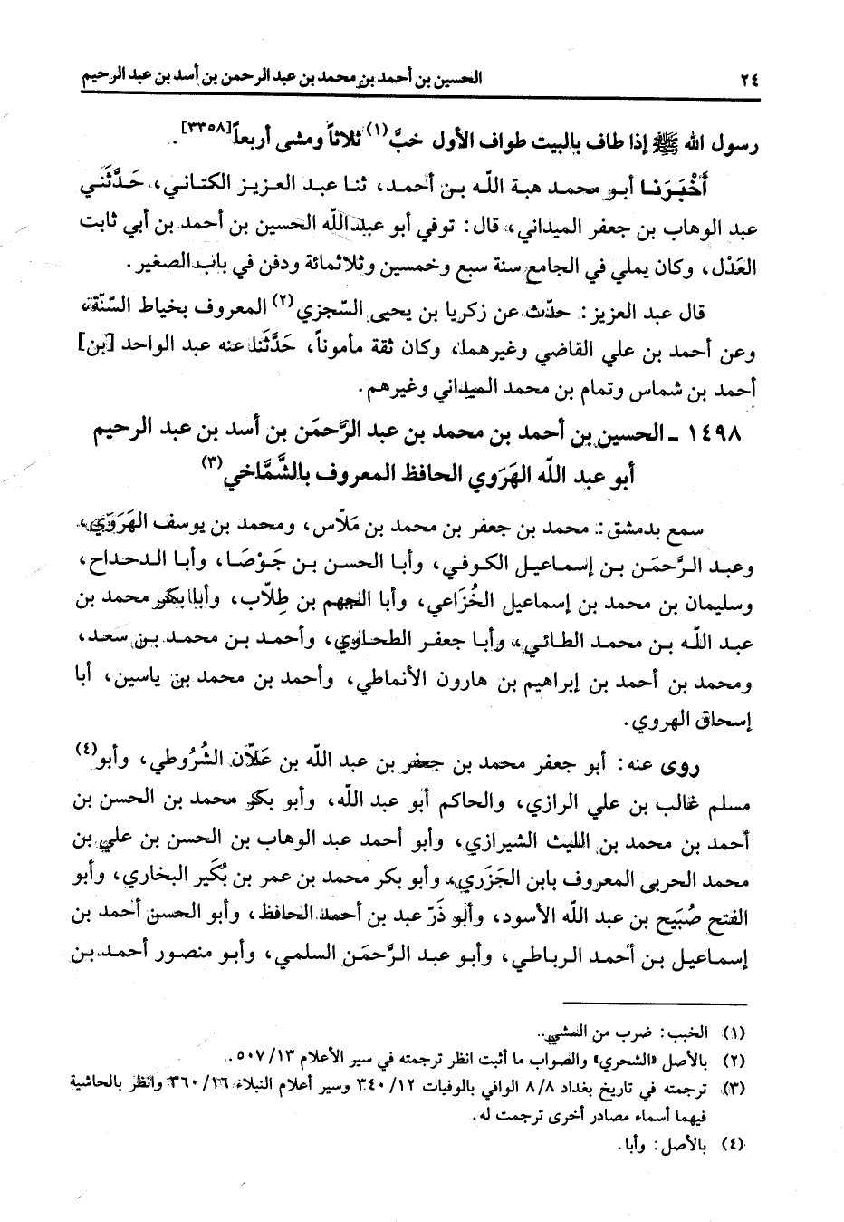 1498 - الحسين بن أحمد بن محمد بن عبد الرحمن بن أسد بن عبد الرحيم أبو عبد الله الهروي الحافظ المعروف بالشماخي (3) سمع بدمشق محمد بن جعفر بن محمد بن ملاس ومحمد بن يوسف الهروي وعبد الرحمن بن إسماعيل الكوفي وأبا الحسن بن جوصا وأبا الدحداح وسليمان بن محمد بن إسماعيل الخزاعي وأبا الجهم بن طلاب وأبا بكر محمد بن عبد الله بن محمد الطائي وأبا جعفر الطحاوي وأحمد بن محمد بن سعد ومحمد بن أحمد بن إبراهيم بن هارون الأنماطي وأحمد بن محمد بن ياسين أبا إسحاق الهروي روى عنه أبو جعفر محمد بن جعفر بن عبد الله بن علان الشروطي وأبو (4) مسلم غالب بن علي الرازي والحاكم أبو عبد الله وأبو بكر محمد بن الحسن بن أحمد بن محمد بن الليث الشيرازي وأبو أحمد عبد الوهاب بن الحسن بن علي بن محمد الحربي المعروف بابن الجزري وأبو بكر محمد بن عمر بن بكير البخاري وأبو الفتح صبيح بن عبد الله الأسود وأبو ذر عبد بن أحمد الحافظ وأبو الحسن أحمد بن إسماعيل بن أحمد الرباطي وأبو عبد الرحمن السلمي وأبو منصور أحمد بن