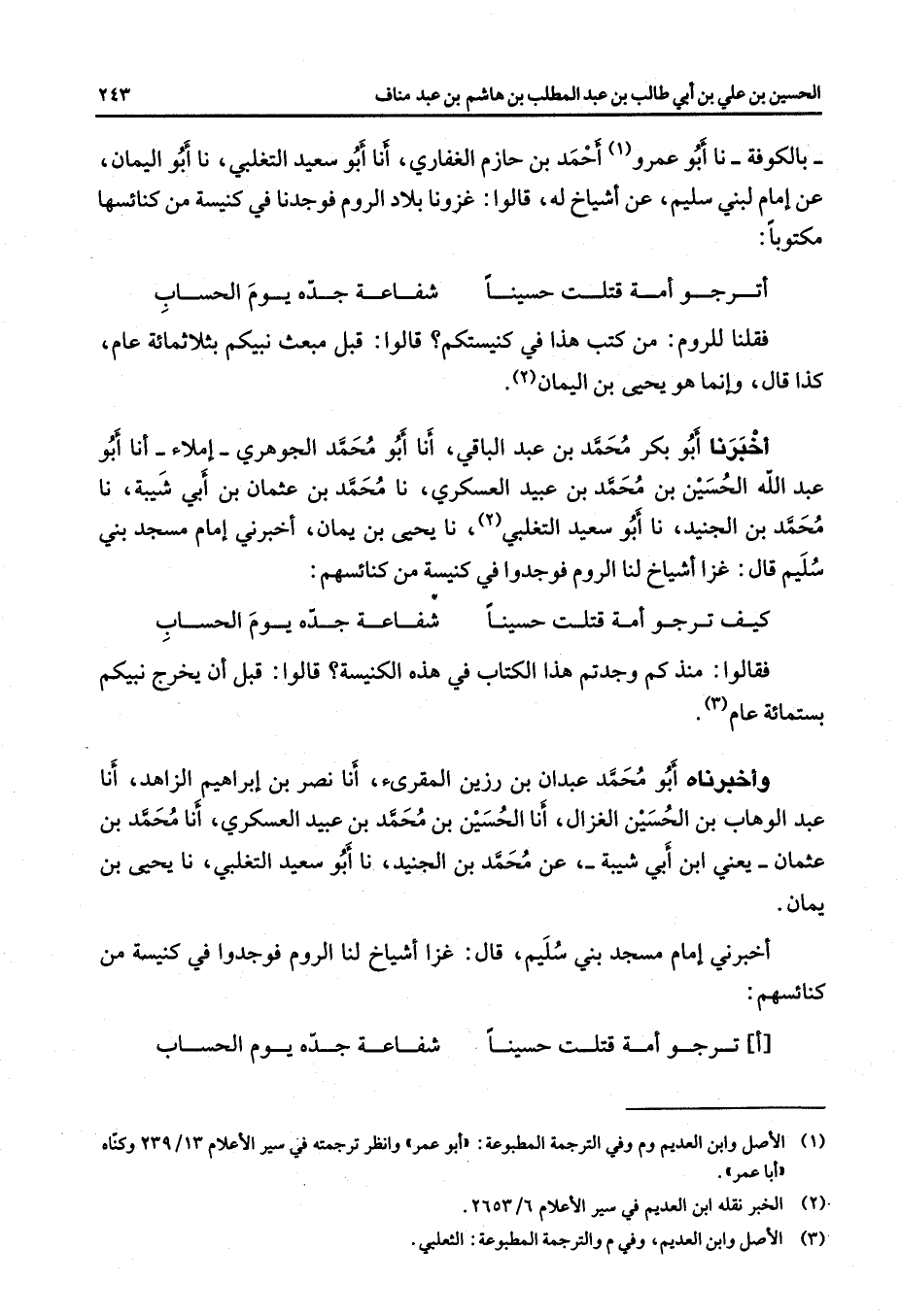 بالكوفة نا أبو عمرو احمد بن حازم الغفاري أنا أبو سعيد التغلي نا أبو اليمان عن إمام لبني سليم عن أشياخ له قالوا غزونا بلاد الروم فوجدنا في كنيسة من كنائسها مكتوبا أترجو أمة قتلت حسينا * شفاعة جده يوم الحساب فقلنا للروم من كتب هذا في كنيستكم قالوا قبل مبعث نبيكم بثلاثمائة عام كذا قال وإنما هو يحيى بن اليمان (2) أخبرنا أبو بكر محمد بن عبد الباقي أنا أبو محمد الجوهري إملاء أنا أبو عبد الله الحسين بن محمد بن عبيد العسكري نا محمد بن عثمان بن أبي شيبة نا محمد بن الجنيد نا أبو سعيد التغلبي (2) نا يحيى بن يمان أخبرني إمام مسجد بني سليم قال غزا أشياخ لنا الروم فوجدوا في كنيسة من كنائسهم كيف ترجو أمة قتلت حسينا * شفاعة جده يوم الحساب فقالوا منذ كم وجدتم هذا الكتاب في هذه الكنيسة قالوا قبل أن يخرج نبيكم بستمائة عام (3) وأخبرناه أبو محمد عبدان بن رزين المقرئ أنا نصر بن إبراهيم الزاهد أنا عبد الوهاب بن الحسين الغزال أنا الحسين بن محمد بن عبيد العسكري أنا محمد بن عثمان يعني ابن أبي شيبة عن محمد بن الجنيد نا أبو سعيد التغلبي نا يحيى بن يمان أخبرني إمام مسجد بني سليم قال غزا أشياخ لنا الروم فوجدوا في كنيسة من كنائسهم أترجو أمة قتلت حسينا * شفاعة جده يوم الحساب