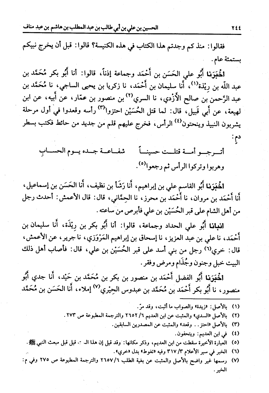 فقالوا منذ كم وجدتم هذا الكتاب في هذه الكنيسة قالوا قبل أن يخرج نبيكم بستمئة عام أخبرنا أبو علي الحسن بن أحمد وجماعة إذنا قالوا أنا أبو بكر محمد بن عبد الله بن ريذة (1) أنا سليمان بن أحمد نا زكريا بن يحيى الساجي نا محمد بن عبد الرحمن بن صالح الأزدي نا السري (2) بن منصور بن عمار عن أبيه عن ابن لهيعة عن أبي قبيل قال لما قتل الحسين احتزوا (3) رأسه وقعدوا في أول مرحلة يشربون النبيذ وينحتون (4) الرأس فخرج عليهم قلم من جديد من حائط فكتب بسطر دم أترجو أمة قتلت حسينا * شفاعة جده يوم الحساب وهربوا وتركوا الرأس ثم رجعوا (5) أخبرنا أبو القاسم علي بن إبراهيم أنا رشأ بن نظيف أنا الحسن بن إسماعيل أنا أحمد بن مروان نا أحمد بن محرز نا الحماني قال قال الأعمش أحدث رجل من أهل الشام على قبر الحسين بن علي فأبرص من ساعته أنبأنا أبو علي الحداد وجماعة قالوا أنا أبو بكر بن ريذة أنا سليمان بن أحمد نا علي بن عبد العزيز نا إسحاق بن إبراهيم المروزي نا جرير عن الأعمش قال خري (6) رجل من بني أسد على قبر الحسين بن علي قال فأصاب أهل ذلك البيت خبل وجنون وجذام ومرض وفقر أخبرنا أبو الفضل أحمد بن منصور بن بكر بن محمد بن حيد أنا جدي أبو منصور نا أبو بكر أحمد بن محمد بن عبدوس الحيري (7) إملاء أنا الحسين بن محمد
