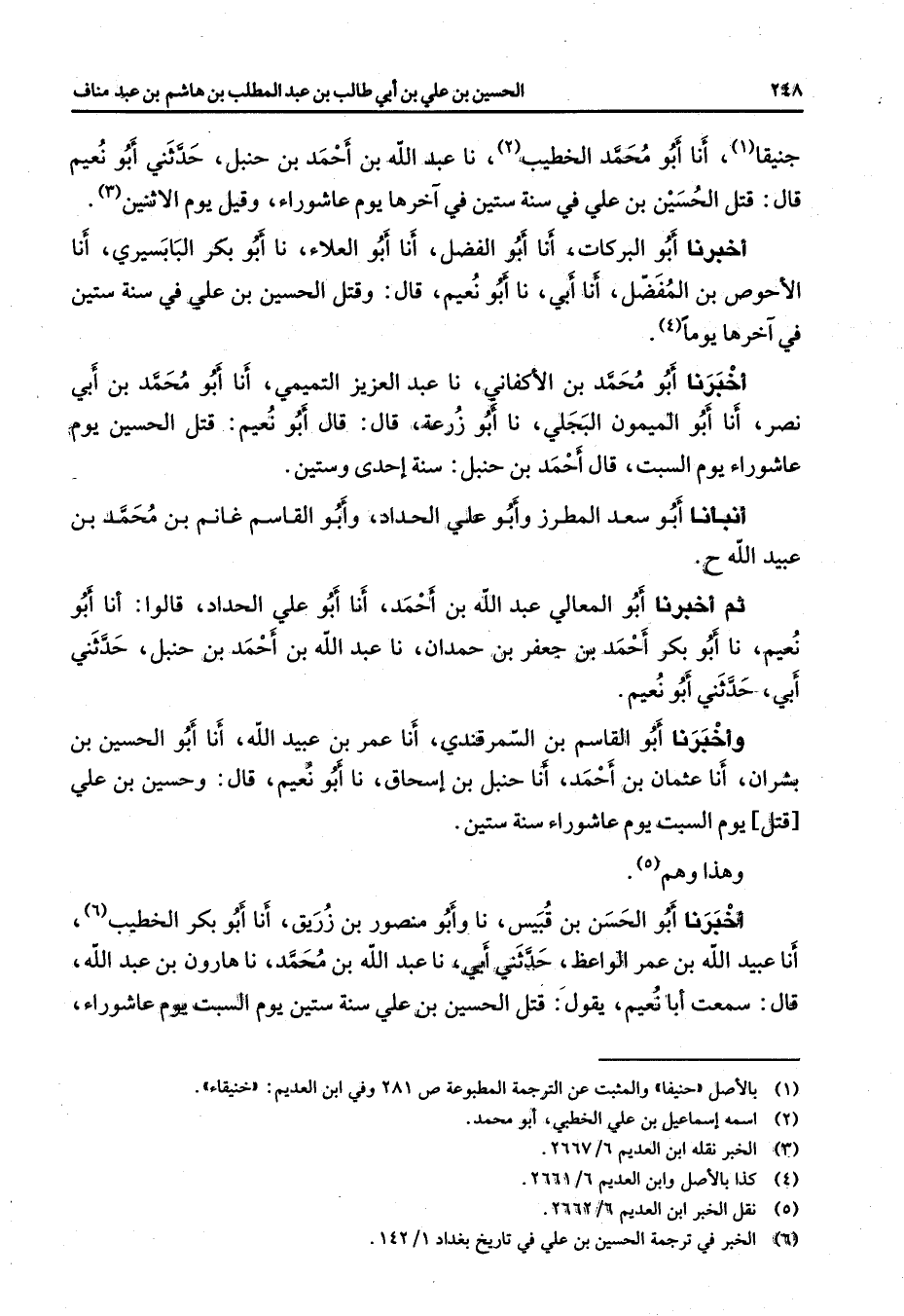 جنيقا (1) أنا أبو محمد الخطيب (2) نا عبد الله بن أحمد بن حنبل حدثني أبو نعيم قال قتل الحسين بن علي في سنة ستين في آخرها يوم عاشوارء وقيل يوم الأثنين (3) أخبرنا أبو البركات أنا أبو الفضل أنا أبو العلاء نا أبو بكر البابسيري أنا الأحوص بن المفضل أنا أبي نا أبو نعيم قال وقتل الحسين بن علي في سنة ستين في آخرها يوما (4) أخبرنا أبو محمد بن الأكفاني نا عبد العزيز التميمي أنا أبو محمد بن أبي نصر أنا أبو الميمون البجلي نا أبو زرعة قال قال أبو نعيم قتل الحسين يوم عاشوراء يوم السبت قال أحمد بن حنبل سنة إحدى وستين أنبأنا أبو سعد المطرز وأبو علي الحداد وأبو القاسم غانم بن محمد بن عبيد الله ح ثم أخبرنا أبو المعالي عبد الله بن أحمد أنا أبو علي الحداد قالوا أنا أبو نعيم نا أبو بكر أحمد بن جعفر بن حمدان نا عبد الله بن أحمد بن حنبل حدثني أبي حدثني أبو نعيم وأخبرنا أبو القاسم بن السمرقندي أنا عمر بن عبيد الله أنا أبو الحسين بن بشران أنا عثمان بن أحمد أنا حنبل بن إسحاق نا أبو نعيم قال وحسين بن علي قتل يوم السبت يوم عاشوراء سنة ستين وهذا وهم (5) أخبرنا أبو الحسن بن قبيس نا وأبو منصور بن زريق أنا أبو بكر الخطيب (6) أنا عبيد الله بن عمر الواعظ حدثني أبي نا عبد الله بن محمد نا هارون بن عبد الله قال سمعت أبا نعيم يقول قتل الحسين بن علي سنة ستين يوم السبت يوم عاشوراء