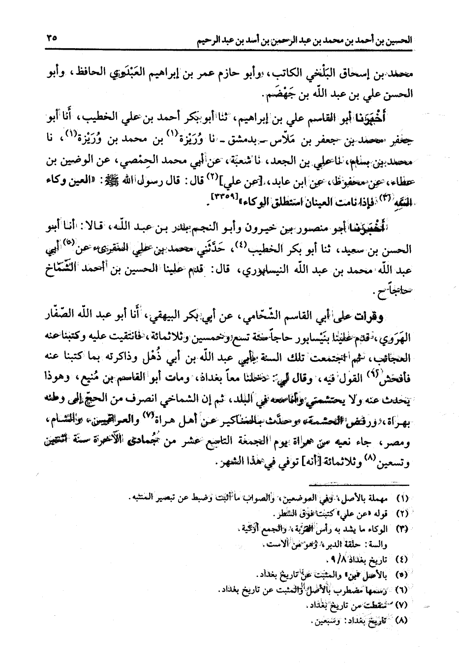 وقرأت على أبي القاسم الشحامي عن أبي بكر البيهقي أنا أبو عبد الله الصفار الهروي قدم علينا بنيسابور حاجا سنة تسع وخمسين وثلاثمائة فانتقيت عليه وكتبنا عنه العجائب ثم اجتمعت تلك السنة بأبي عبد الله بن أبي ذهل وذاكرته بما كتبنا عنه فافحش (6) القول فيه وقال لي دخلنا معا بغداذ ومات أبو القاسم بن منيع وهو ذا يحدث عنه ولا يحتشمني وأنا معه في البلد ثم إن الشماخي انصرف من الحج إلى وطنه بهراة ورفض الحشمة وحدث بالمناكير عن أهل هراة (7) والعراقيين والشام ومصر جاء نعيه من هراة يوم الجمعة التاسع عشر من جمادى الآخرة سنة اثنتين وتسعين (8) وثلاثمائة أنه توفي في هذا الشهر
