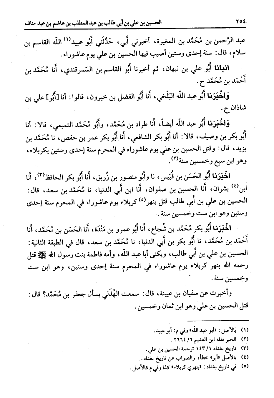 عبد الرحمن بن محمد بن المغيرة أخبرني أبي حدثني أبو عبيد (1) الله القاسم بن سلام قال سنة إحدى وستين أصيب فيها الحسين بن علي يوم عاشوراء أنبأنا أبو علي بن نبهان ثم أخبرنا أبو القاسم بن السمرقندي أنا محمد بن أحمد بن محمد ح وأخبرنا أبو عبد الله البلخي أنا أبو الفضل بن خيرون قالوا أنا أبو علي بن شاذان ح وأخبرنا أبو عبد الله أيضا أنا طراد بن محمد وأبو محمد التميمي قالا أنا أبو بكر بن وصيف قالا أنا أبو بكر الشافعي أنا أبو بكر عمر بن حفص نا محمد بن يزيد قال وقتل الحسين بن علي يوم عاشوراء في المحرم سنة إحدى وستين بكربلاء وهو ابن سبع وخمسين سنة (2) أخبرنا أبو الحسن بن قبيس نا وأبو منصور بن زريق أنا أبو بكر الحافظ (3) أنا ابن (4) بشران أنا الحسين بن صفوان أنا ابن أبي الدنيا نا محمد بن سعد قال الحسين بن علي بن أبي طالب قتل بنهرأ (5) كربلاء يوم عاشوراء في المحرم سنة إحدى وستين وهو ابن ست وخمسين سنة أخبرنا أبو بكر محمد بن شجاع أنا أبو عمرو بن مندة أنا الحسن بن محمد أنا أحمد بن محمد نا أبو بكر بن أبي الدنيا نا محمد بن سعد قال في الطبقة الثانية الحسين بن علي بن أبي طالب ويكنى أبا عبد الله وأمه فاطمة بت رسول الله (صلى الله عليه وسلم) قتل رحمه الله بنهر كربلاء يوم عاشوراء في المحرم سنة إحدى وستين وهو ابن ست وخمسين سنة وأخبرت عن سفيان بن عيينة قال سمعت الهذلي يسأل جعفر بن محمد قال قتل الحسين بن علي وهو ابن ثمان وخمسين
