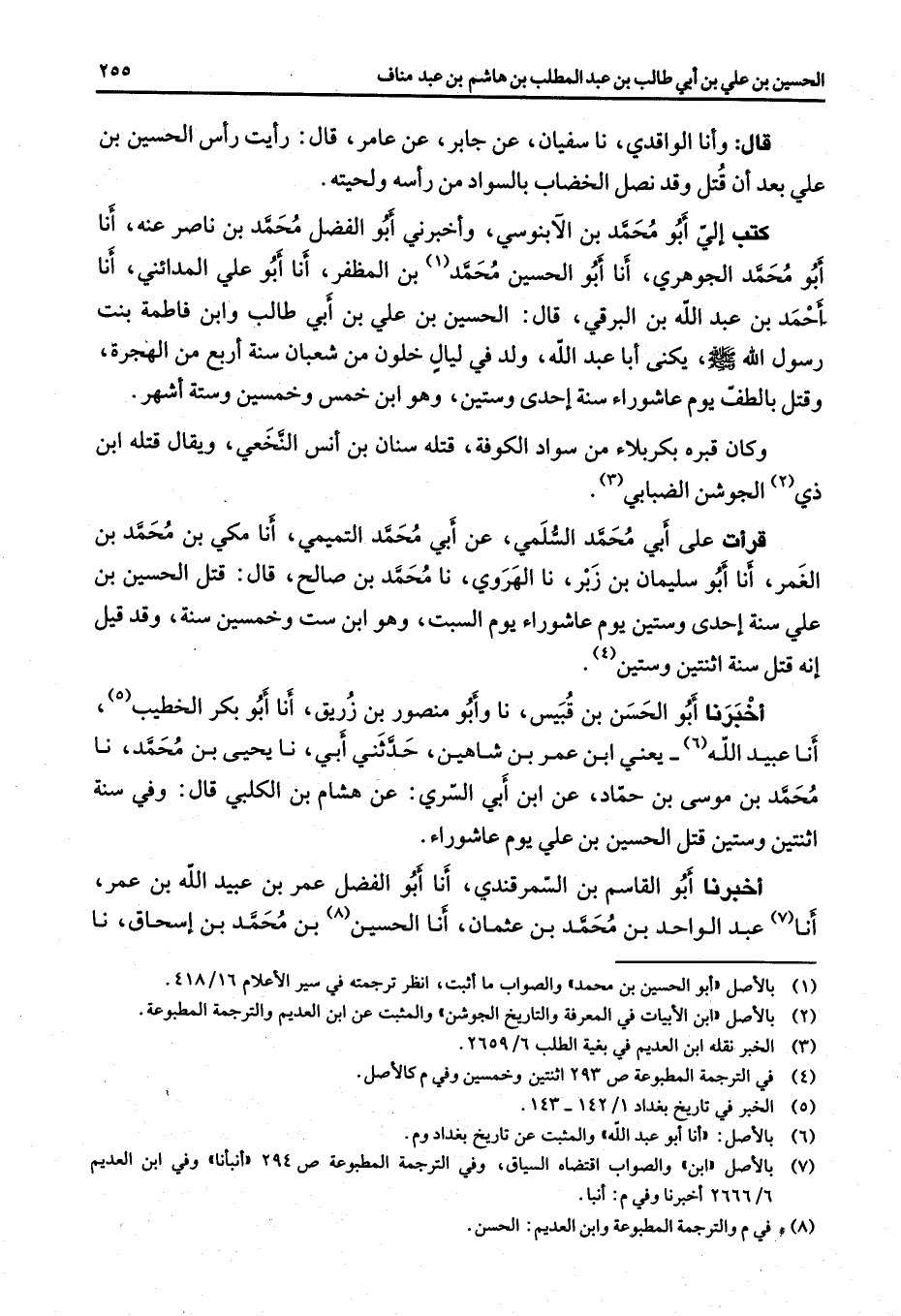 قال وأنا الواقدي نا سفيان عن جابر عن عامر قال رأيت رأس الحسين بن علي بعد أن قتل وقد نصل الخضاب بالسواد من رأسه ولحيته كتب إلي أبو محمد بن الآبنوسي واخبرني أبو الفضل محمد بن ناصر عنه أنا أبو محمد الجوهري أنا أبو الحسين محمد (1) بن المظفر أنا أبو علي المدائني أنا أحمد بن عبد الله بن البرقي قال الحسين بن علي بن أبي طالب وابن فاطمة بنت رسول الله (صلى الله عليه وسلم) يكنى أبا عبد الله ولد في ليال خلون من شعبان سنة أربع من الهجرة وقتل بالطف يوم عاشوراء سنة إحدى وستين وهو ابن خمس وخمسين وستة أشهر وكان قبره بكربلاء من سواد الكوفة قتله سنان بن انس النخعي ويقال قتله ابن ذي (2) الجوشن الضبابي (3) قرأت على أبي محمد السلمي عن أبي محمد التميمي أنا مكي بن محمد بن الغمر أنا أبو سليمان بن زبر نا الهروي نا محمد بن صالح قال قتل الحسين بن علي سنة إحدى وستين يوم عاشوراء يوم السبت وهو ابن ست وخمسين سنة وقد قيل أنه قتل سنة اثنتين وستين (4) اخبرنا أبو الحسن بن قبيس نا وأبو منصور بن زريق أنا أبو بكر الخطيب (5) أنا عبيد الله (6) يعني ابن عمر بن شاهين حدثني أبي نا يحيى بن محمد نا محمد بن موسى بن حماد عن ابن أبي السري عن هشام بن الكلبي قال وفي سنة اثنتين وستين قتل الحسين بن علي يوم عاشوراء أخبرنا أبو القاسم بن السمرقندي أنا أبو الفضل عمر بن عبيد الله بن عمر أنا (7) عبد الواحد بن محمد بن عثمان أنا الحسين (8) بن محمد بن إسحاق نا