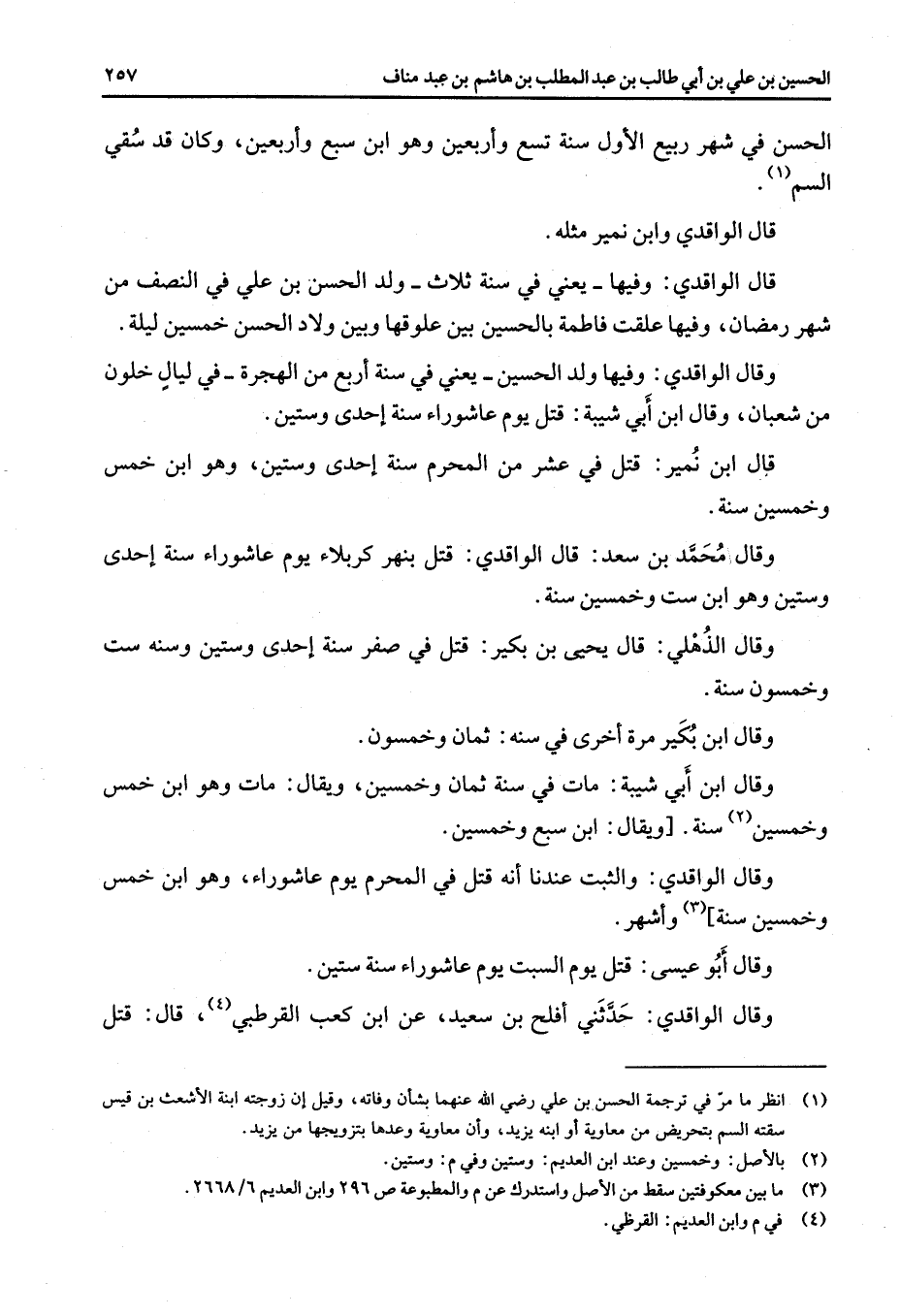 الحسن في شهر ربيع الأول سنة تسع وأربعين وهو ابن سبع وأربعين وكان قد سقي السم (1) قال الواقدي وابن نمير مثله قال الواقدي وفيها يعني في سنة ثلاث ولد الحسن بن علي في النصف من شهر رمضان وفيها علقت فاطمة بالحسين بين علوقها وبين ولاد الحسن خمسين ليلة وقال الواقدي وفيها ولد الحسين يعني في سنة أربع من الهجرة في ليال خلون من شعبان وقال ابن أبي شيبة قتل يوم عاشوراء سنة إحدى وستين قال ابن نمير قتل في عشر من المحرم سنة إحدى وستين وهو ابن خمس وخمسين سنة وقال محمد بن سعد قال الواقدي قتل بنهر كربلاء يوم عاشوراء سنة إحدى وستين وهو ابن ست وخمسين سنة وقال الذهلي قال يحيى بن بكير قتل في صفر سنة إحدى وستين وسنه ست وخمسون سنة وقال ابن بكير مرة أخرى في سنه ثمان وخمسون وقال ابن أبي شيبة مات في سنه ثمان وخمسين ويقال مات وهو ابن خمس وخمسين (2) سنة ويقال ابن سبع وخمسين وقال الواقدي والثبت عندنا أنه قتل في المحرم يوم عاشوراء وهو ابن خمس وخمسين سنة (3) وأشهر وقال أبو عيسى قتل يوم السبت يوم عاشوراء سنة ستين وقال الواقدي حدثني أفلح بن سعيد عن ابن كعب القرطبي (4) قال قتل
