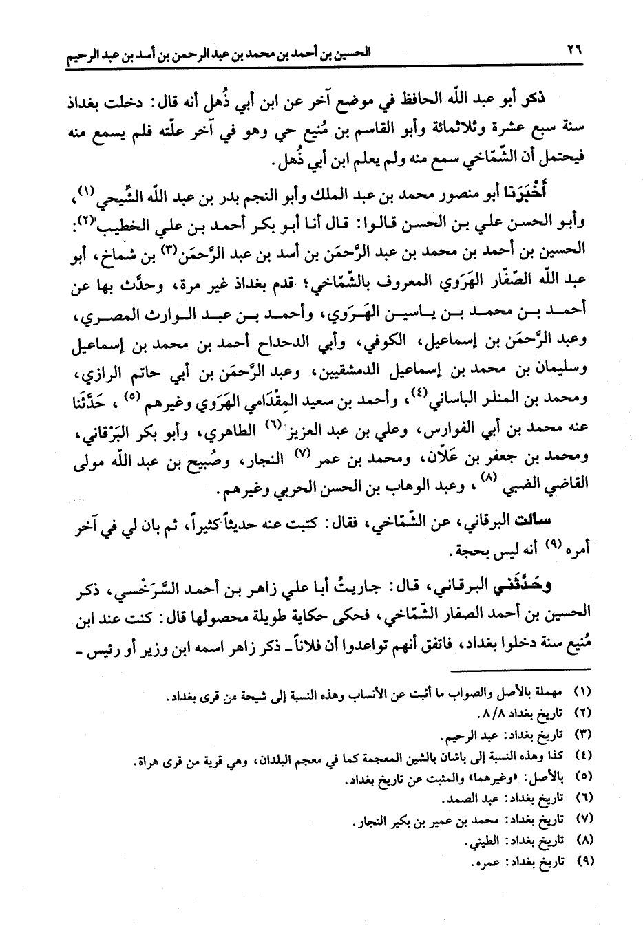 ذكر أبو عبد الله الحافظ في موضع آخر عن ابن أبي ذهل أنه قال دخلت بغداذ سنة سبع عشرة وثلاثمائة وأبو القاسم بن منيع حي وهو في آخر علته فلم يسمع منه فيحتمل أن الشماخي سمع منه ولم يعلم ابن أبي ذهل أخبرنا أبو منصور محمد بن عبد الملك وأبو النجم بدر بن عبد الله الشيحي (1) وأبو الحسن علي بن الحسن قالوا قال أنا أبو بكر أحمد بن علي الخطيب (2) : الحسين بن أحمد بن محمد بن عبد الرحمن بن أسد بن عبد الرحمن (3) بن شماخ أبو عبد الله الصفار الهروي المعروف بالشماخي قدم بغداد غير مرة وحدث بها عن أحمد بن محمد بن ياسين الهروي وأحمد بن عبد الوارث المصري وعبد الرحمن بن إسماعيل الكوفي وأبي الدحداح أحمد بن محمد بن إسماعيل وسليمان بن محمد بن إسماعيل الدمشقيين وعبد الرحمن بن أبي حاتم الرازي ومحمد بن المنذر الباساني (4) وأحمد بن سعيد المقدامي الهروي وغيرهم (5) حدثنا عنه محمد بن أبي الفوارس وعلي بن عبد العزيز (6) الطاهري وأبو بكر البرقاني ومحمد بن جعفر بن علان ومحمد بن عمر (7) النجار وصبيح بن عبد الله مولى القاضي الضبي (8) وعبد الوهاب بن الحسن الحربي وغيرهم