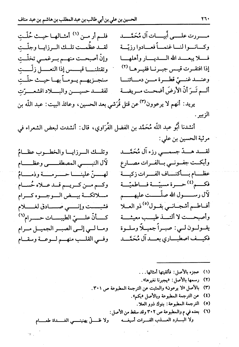 مررت على أبيات آل محمد * فلم أر من (1) أمثالها حيث حلت وكانوا لنا غنما فعادوا رزية * لقد عظمت تلك الرزايا وجلت فلا يبعد الله الديار وأهلها * وإن أصبحت منهم برغمي تجلت إذا افتقرت قيس جبرنا فقيرها (2) * وتقلنا قيس إذا النعل زلت وعند غني قطرة من دمائنا * سنجزيهم يوما بها حيث حلت ألم تر أن الأرض أضحت مريضة * لفقد حسين والبلاد اقشعرت يريد أنهم لا يرعون (3) عن قتل قرشي بعد الحسين وعائذ البيت عبد الله بن الزببير أنشدنا أبو عبد الله محمد بن الفضل الفراوي قال انشدت لبعض الشعراء في مرثية الحسين بن علي لقد هد جسمي رزء آل محمد * وتلك الرزايا والخطوب عظام وأبكت جفوني بالفرات مصارع * لآل النبي المصطفى وعظام عظام بأكناف الفرات زكية * لهن علينا حرمة وذمام فكم (4) حرة مسبية فاطمية * وكم من كريم قد علاه حسام لآل رسول الله صلت عليهم * ملائكة بيض الوجوه كرام أفاطم أشجاني بقول (5) ذو العلا * فشبت وإني صادق لغلام وأصبحت لا التذ طيب معيشة * كأن علي الطيبات حرام (6) يقولون لي صبرا جميلا وسلوة * ومالي إلى الصبر الجميل مرام فكيف اصطباري بعدآل محمد * وفي القلب منهم لوعة وسقام