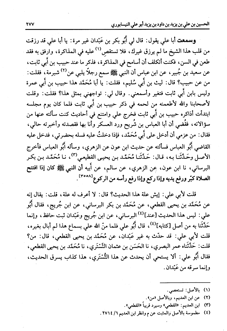 وسمعت أبا علي يقول قال لي أبو بكر بن عبدان غير مرة يا أبا علي قد رزقت من قلب هذا الشيخ ما لم يرزق غيرك فلا تستقص (1) عليه في المذاكرة وارفق به فقد طعن في السن فكنت أتكلف أن أسامح في المذاكرة فذكر ما عند حبيب بن أبي ثابت عن سعيد بن جبير عن ابن عباس أن النببي (صلى الله عليه وسلم) سمع رجلا يلبي عن (2) شبرمة فقلت من عن حبيب قال ليث بن أبي سليم فقلت يا أبا محمد هذا حبيب بن أبي عمرة وليس بابن أبي ثابت فتغير واسمعني وقال لي تواجهني بمثل هذا فقلت وقلت لأصحابنا والله لأطعمنه من لحمه في ذكر حبيب بن أبي ثابت فلما كان يوم مجلسه ابتدأت أذاكره حبيب بن أبي ثابت فخرج علي وامتنع في احاديث كنت سألته عنها من سؤالاته فقضي أن أبا العباس بن شريح ورد العسكر وأنا بها فقصدته وأخبرته حالي فقال من عزمي أن أدخل على أبي محمد فإذا دخلت عليه فسله بحضرتي فدخل عليه القاضي أبو العباس فسألته عن حديث ابن عون عن الزهري وسأله أبو العباس فأخرج الأصل وحدثنا به قال حدثنا محمد بن يحيى القطيعي (3) نا محمد بن بكر البرساني نا ابن عون عن الزهري عن سالم عن أبيه أن النبي (صلى الله عليه وسلم) كان إذا افتتح الصلاة كبر ورفع يديه وإذا ركع وإذا رفع راسه من الركوع قلت لأبي علي إيش علة هذا الحديث قال لا أعرف له علة قلت يقال إنه عن محمد بن يحيى القطعي عن محمد بن بكر البرساني عن ابن جريج فقال أبو علي ليس هذا الحديث عند (4) البرساني عن ابن جريج وعبدان ثبت حافظ وإنما حدثنا به من أصل كتابه (4) قال أبو علي فلما من الله علي بسماع هذا لم أبال بغيره قلت لأبي علي قد حدث به غير عبدان عن محمد بن يحيى القطعي قال من قلت حدثناه عمر البصري نا الحسن بن عثمان التستري نا محمد بن يحيى القطعي فقال أبو علي ألا يستحي أن يحدث عن هذا التستري هذا كذاب يسرق الحديث وإنما سرقه من عبدان