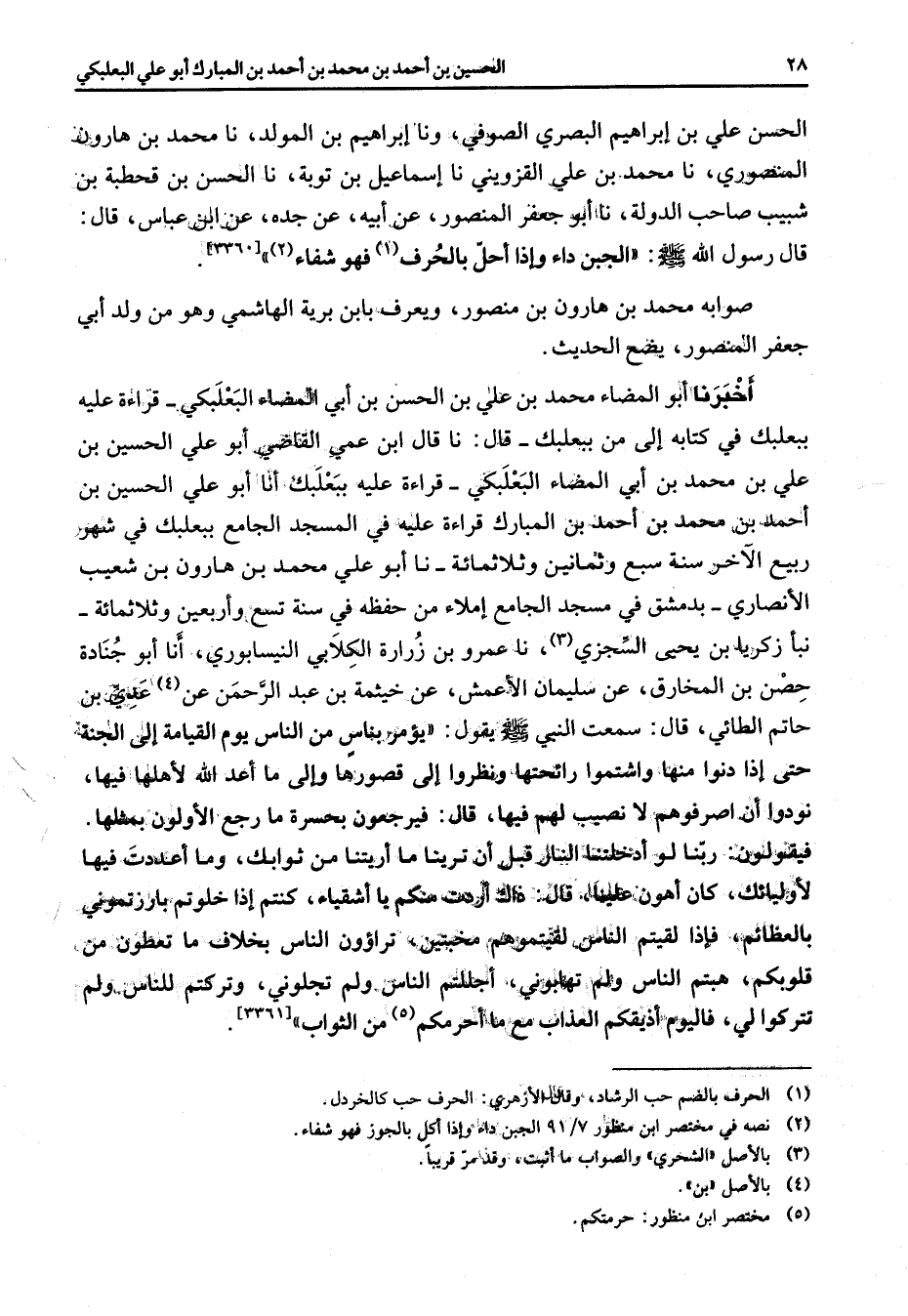 الحسن علي بن إبراهيم البصري الصوفي ونا إبراهيم بن المولد نا محمد بن هارون المنصوري نا محمد بن علي القزويني نا إسماعيل بن توبة نا الحسن بن قحطبة بن شبيب صاحب الدولة نا أبو جعفر المنصور عن أبيه عن جده عن ابن عباس قال قال رسول الله (صلى الله عليه وسلم) الجبن داء وإذا أحل بالحرف (1) فهو شفاء (2)) صوابه محمد بن هارون بن منصور ويعرف بابن برية الهاشمي وهو من ولد أبي جعفر المنصور يضع الحديث أخبرنا أبو المضاء محمد بن علي بن الحسن بن أبي المضاء البعلبكي قراءة عليه ببعلبك في كتابه إلى من ببعلبك قال نا قال ابن عمي القاضي أبو علي الحسين بن علي بن محمد بن أبي المضاء البعلبكي قراءة عليه ببعلبك أنا أبو علي الحسين بن أحمد بن محمد بن أحمد بن المبارك قراءة عليه في المسجد الجامع ببعلبك في شهر ربيع الآخر سنة سبع وثمانين وثلاثمائة نا أبو علي محمد بن هارون بن شعيب الأنصاري بدمشق في مسجد الجامع إملاء من حفظه في سنة تسع وأربعين وثلاثمائة نبأ زكريا بن يحيى السجزي (3) نا عمرو بن زرارة الكلابي النيسابوري أنا أبو جنادة حصن بن المخارق عن سليمان الأعمش عن خيثمة بن عبد الرحمن عن (4) عدي بن حاتم الطائي قال سمعت النبي (صلى الله عليه وسلم) يقول يؤمر بناس من الناس يوم القيامة إلى الجنة حتى إذا دنوامنها واشتموا رائحتها ونظروا إلى قصورها وإلى ما أعد الله لأهلها فيها نودوا أن اصرفوهم لا نصيب لهم فيها قال فيرجعون بحسرة ما رجع الأولون بمثلها فيقولون ربنا لو أدخلتنا النار قبل أن ترينا ما أريتنا من ثوابك وما أعددت فيها لأوليائك كان أهون علينا قال ذاك أردت منكم يا أشقياء كنتم إذا خلوتم بارزتموني بالعظائم فإذا لقيتم الناس لقيتموهم مخبتين تراؤون الناس بخلاف ما تعطون من قلوبكم هبتم الناس ولم تهابوني أجللتم الناس ولم تجلوني وتركتم للناس ولم تتركوا لي فاليوم أذيقكم العذاب مع ما أحرمكم (5) من الثواب)