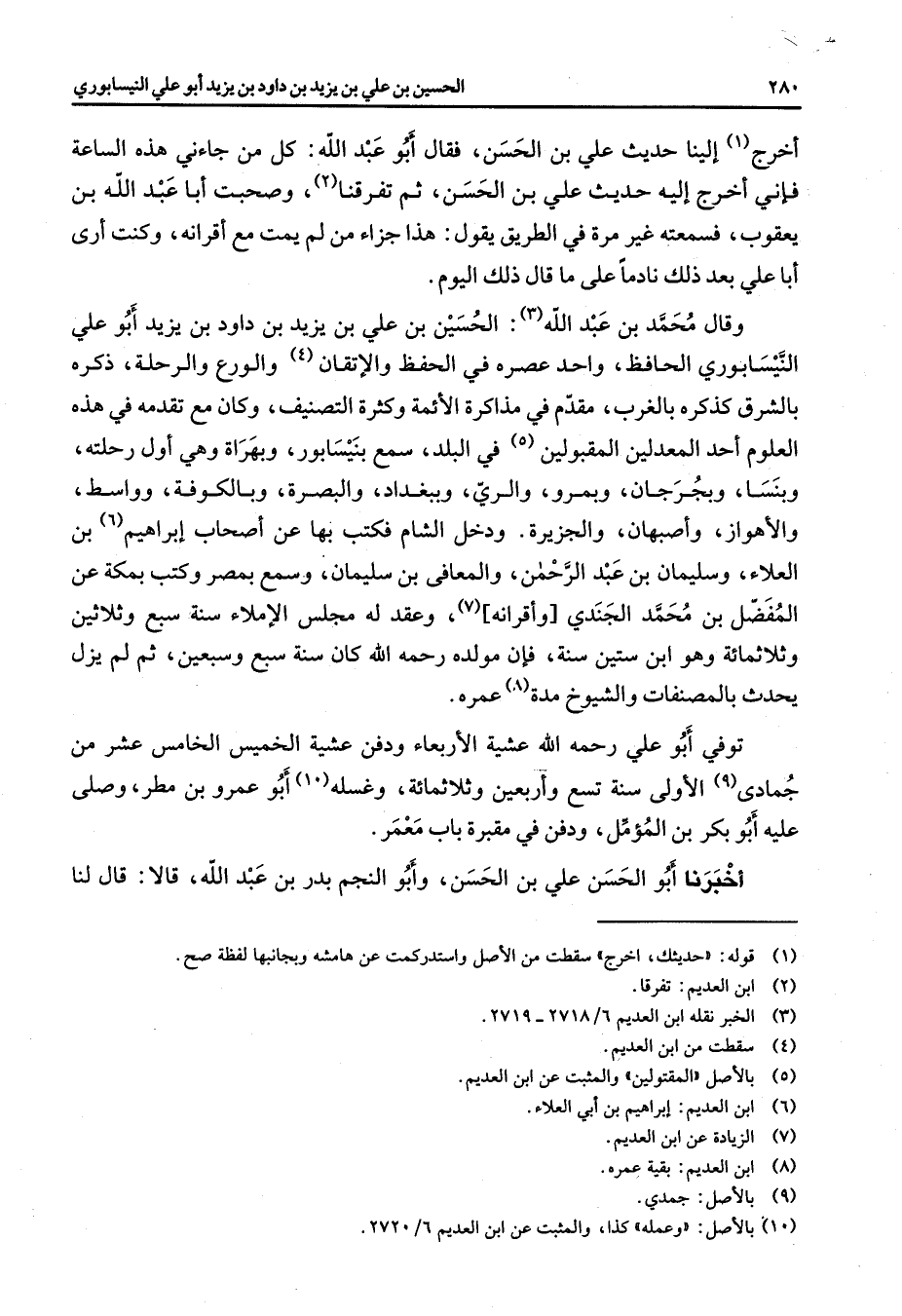 أخرج (1) إلينا حديث علي بن الحسن فقال أبو عبد الله كل من جاءني هذه الساعة فإني أخرج إليه حديث علي بن الحسن ثم تفرقنا (2) وصحبت أبا عبد الله بن يعقوب فسمعته غير مرة في الطريق يقول هذا جزاء من لم يمت مع أقرانه وكنت أرى أبا علي بعد ذلك نادما على ما قال ذلك اليوم وقال محمد بن عبد الله (3) الحسين بن علي بن يزيد بن داود بن يزيد أبو علي النيسابوري الحافظ واحد عصره في الحفظ والإتقان (4) والورع والرحلة ذكره بالشرق كذكره بالغرب مقدم في مذاكرة الأئمة وكثرة التصنيف وكان مع تقدمه في هذه العلوم أحد المعدلين المقبولين (5) في البلد سمع بنيسابور وبهراة وهي أول رحلته وبنسا وبجرجان وبمرو والري وببغداد والبصرة وبالكوفة وواسط والأهواز وأصبهان والجزيزة ودخل الشام فكتب بها عن أصحاب إبراهيم (6) بن العلاء وسليمان بن عبد الرحمن والمعافى بن سليمان وسمع بمصر وكتب بمكة عن المفضل بن محمد الجندي وأقرانه (7) وعقد له مجلس الإملاء سنة سبع وثلاثين وثلاثمائة وهو ابن ستين سنة فإن مولده رحمة الله كان سنة سبع وسبعين ثم لم يزل يحدث بالمصنفات والشيوخ مدة (8) عمره توفي أبو علي رحمة الله عشية الأربعاء ودفن عشية الخميس الخامس عشر من جمادى (9) الأولى سنة تسع وأربعين وثلاثمائة وغسله (10) أبو عمرو بن مطر وصلى عليه أبو بكر بن المؤمل ودفن في مقبرة باب معمر أخبرنا أبو الحسن علي بن الحسن وأبو النجم بدر بن عبد الله قالا قال لنا