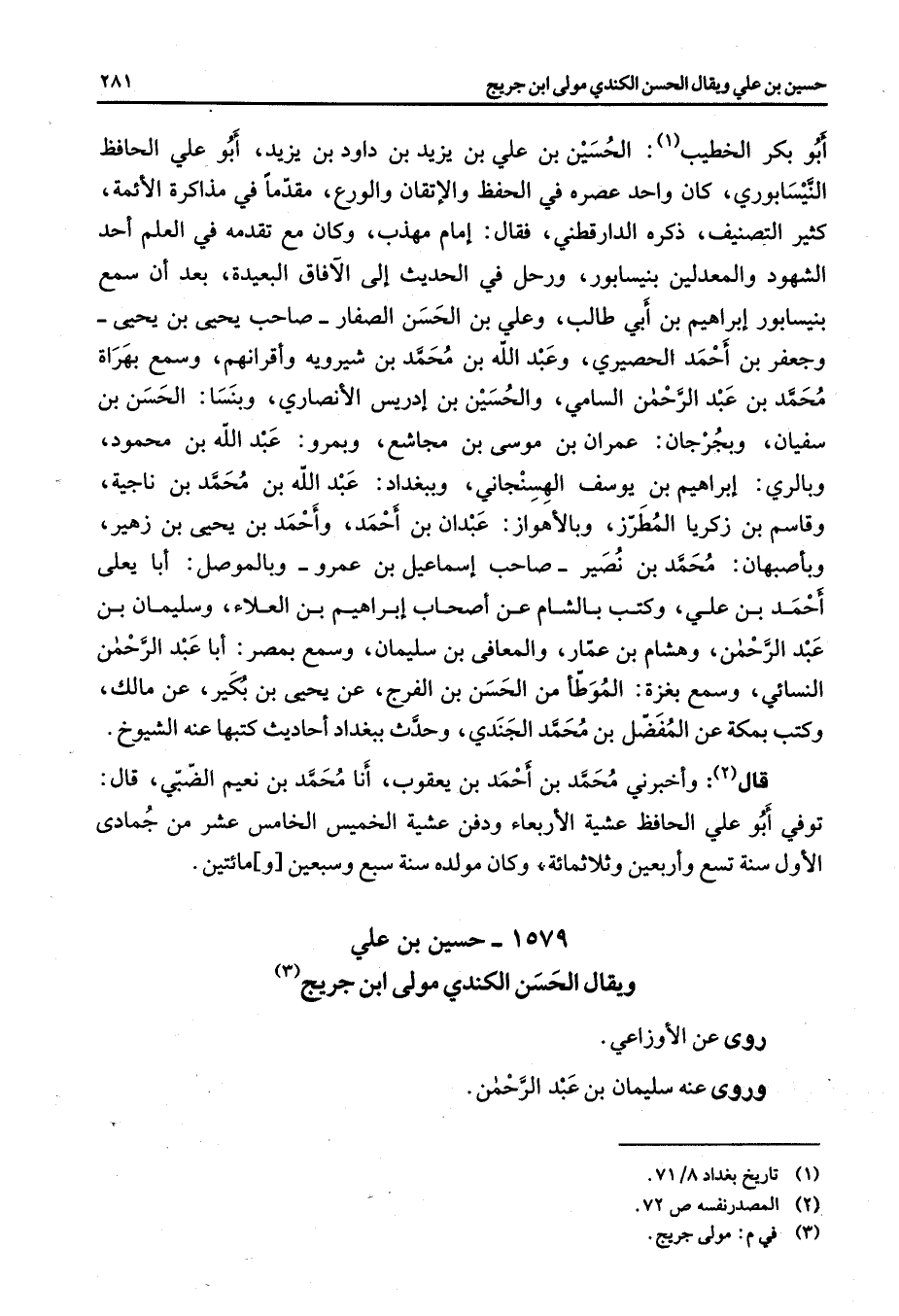1579 - حسين بن علي ويقال الحسن الكندي مولى ابن جريج (3) روى عن الأوزاعي روى عنه سليمان بن عبد الرحمن