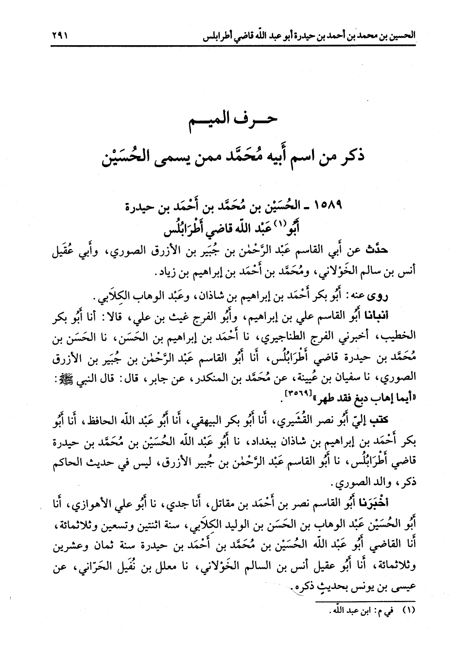 1589 - الحسين بن محمد بن أحمد بن حيدرة أبو (1) عبد الله قاضي أطرابلس حدث عن أبي القاسم عبد الرحمن بن جبير بن الأزرق الصوري وأبي عقيل أنس بن سالم الخولاني ومحمد بن أحمد بن إبراهيم بن زياد روى عنه أبو بكر أحمد بن إبراهيم بن شاذان وعبد الوهاب الكلابي أنبأنا أبو القاسم علي بن إبراهيم وأبو الفرج غيث بن علي قالا أنا أبو بكر الخطيب أخبرني الفرج الطناجيري نا أحمد بن إبراهيم بن الحسن نا الحسن بن محمد بن حيدرة قاضي أطرابلس أنا أبو القاسم عبد الرحمن بن جبير بن الأزرق الصوري نا سفيان بن عيينة عن محمد بن المنكدر عن جابر قال قال النبي (صلى الله عليه وسلم أيما إهاب دبغ فقد طهر كتب إلي أبو نصر القشيري أنا أبو بكر البيهقي أنا أبو عبد الله الحافظ أنا أبو بكر أحمد بن إبراهيم بن شاذان ببغداد نا أبو عبد الله الحسين بن محمد بن حيدرة قاضي أطرابلس نا أبو القاسم عبد الرحمن بن جبير الأزرق ليس في حديث الحاكم ذكر والد الصوري أخبرنا أبو القاسم نصر بن أحمد بن مقاتل أنا جدي نا أبو علي الأهوازي أنا أبو الحسين عبد الوهاب بن الحسن بن الوليد الكلابي سنة اثنتين وتسعين وثلاثمائة أنا القاضي أبو عبد الله الحسين بن محمد بن أحمد بن حيدرة سنة ثمان وعشرين وثلاثمائة أنا أبو عقيل أنس بن السالم الخولاني نا معلل بن نفيل الحراني عن عيسى بن يونس بحديث ذكره