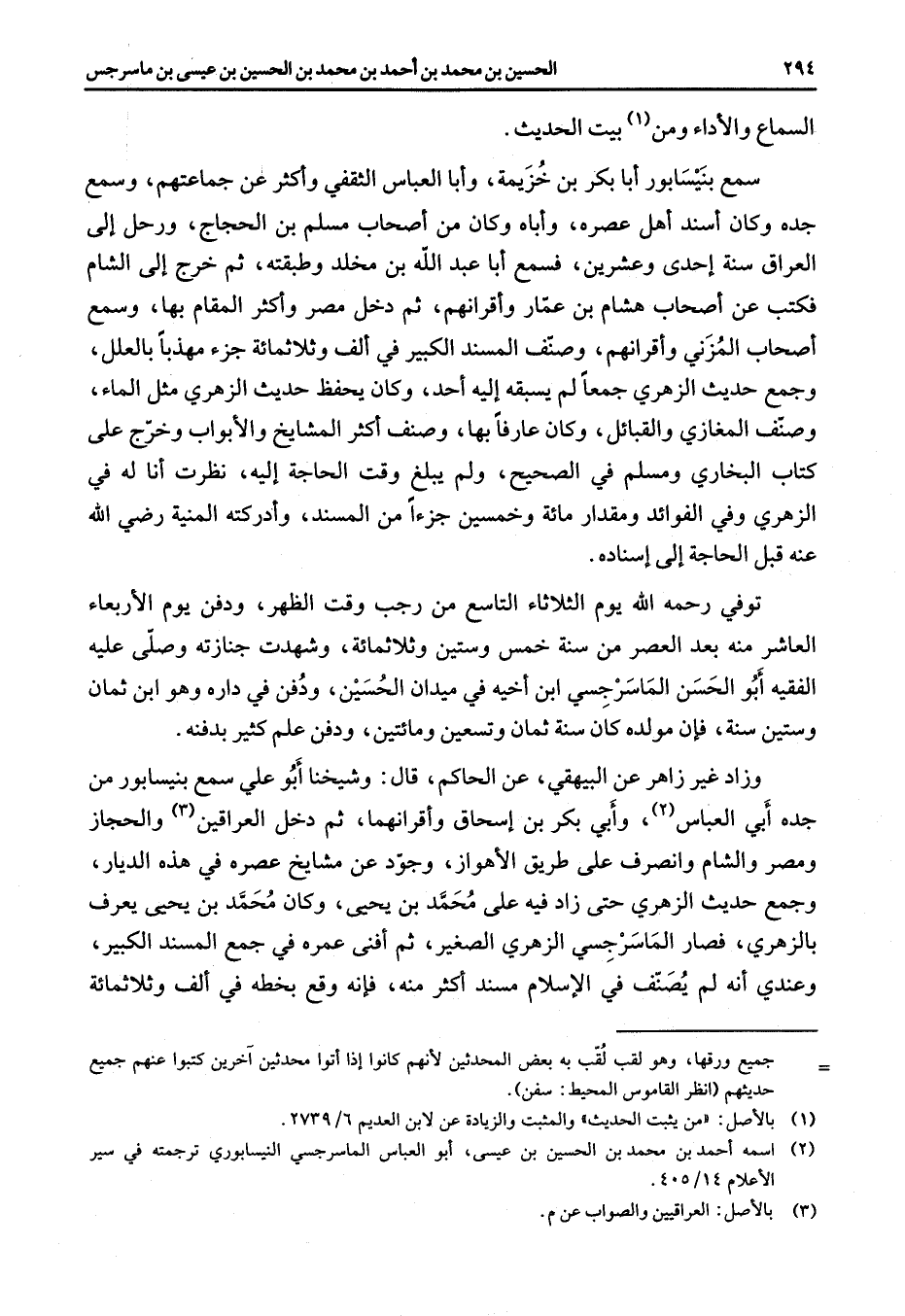 (2) اسمه أحمد بن محمد بن الحسين بن عيسى أبو العباس الماسرجسي النيسابوري ترجمته في سير الاعلام 14 / 405