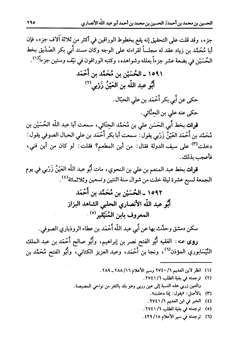 1592 - الحسين بن محمد بن أحمد أبو عبد الله الأنصاري الحلبي الشاهد البزاز المعروف بابن المنيقير (5) سكن بدمشق وحدث بها عن أبي عبد الله أحمد بن عطاء الروذباري الصوفي روى عنه الفقيه أبو الفتح نصر بن إبراهيم وأبو صالح أحمد بن عبد الملك النيسابوري المؤذن (6) ونجا بن أحمد وعبد العزيز الكتاني وأبو الفتح محمد بن