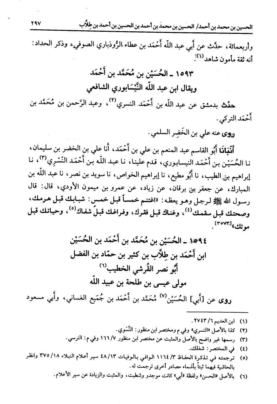 1594 - الحسين بن محمد بن أحمد بن الحسين بن أحمد بن طلاب بن كثير بن حماد بن الفضل أبو نصر القرشي الخطيب (6) مولى عيسى بن طلحة بن عبيد الله روى عن أبي الحسين (7) محمد بن أحمد بن جميع الغساني وأبي مسعود