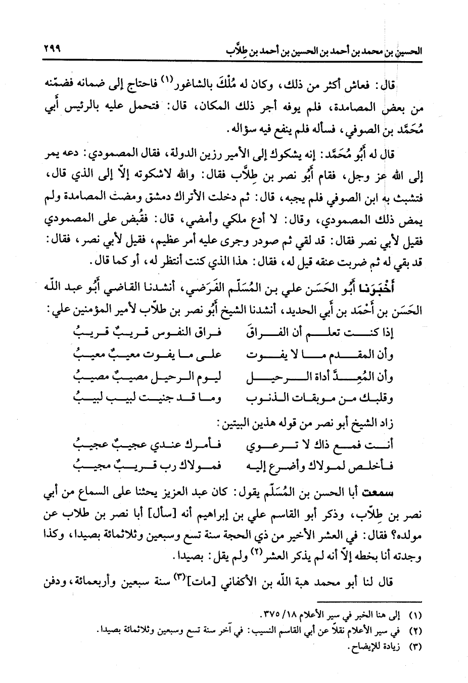 قال فعاش أكثر من ذلك وكان له ملك بالشاغور (1) فاحتاج إلى ضمانه فضمنه من بعض المصامدة فلم يوفه أجر ذلك المكان قال فتحمل عليه بالرئيس أبي محمد بن الصوفي فسأله فلم ينفع فيه سؤاله قال له أبو محمد إنه يشكوك إلى الأمير رزين الدولة فقال المصمودي دعه يمر إلى الله عز وجل فقام أبو نصر بن طلاب فقال والله لا شكوته إلا إلى الذي قال فتشبث به ابن الصوفي فلم يجبه قال ثم دخلت الأتراك دمشق ومضت المصامدة ولم يمض ذلك المصمودي وقال لا أدع ملكي وأمضي قال فقبض على المصمودي فقيل لأبي نصر فقال قد لقي ثم صودر وجرى عليه أمر عظيم فقيل لأبي نصر فقال قد بقي له ثم ضربت عنقه قيل له فقال هذا الذي كنت أنتظر له أو كما قال أخبرنا أبو الحسن علي بن المسلم الفرضي أنشدنا القاضي أبو عبد الله الحسن بن أحمد بن أبي الحديد أنشدنا الشيخ أبو نصر بن طلاب لأمير المؤمنين علي إذا كنت تعلم أن الفراق * فراق النفوس قريب قريب وأن المقدم ما لا يفوت * على ما يفوت معيب معيب وأن المعد أداة الرحيل * ليوم الرحيل مصيب مصيب وقلبك من موبقات الذنوب * وما قد جنيت لبيب لبيب زاد الشيخ أبو نصر من قوله هذين البيتين أنت فمع ذاك لا ترعوي * فأمرك عندي عجيب عجيب فأخلص لمولاك وأضرع إليه * فمولاك رب قريب مجيب سمعت أبا الحسن بن المسلم يقول كان عبد العزيز يحثنا على السماع من أبي نصر بن طلاب وذكر أبو القاسم علي بن إبراهيم أنه سأل أبا نصر بن طلاب عن مولده فقال في العشر الأخير من ذي الحجة سنة تسع وسبعين وثلاثمائة بصيدا وكذا وجدته أنا بخطه إلا أنه لم يذكر العشر (2) ولم يقل بصيدا قال لنا أبو محمد هبة الله بن الأكفاني مات (3) سنة سبعين وأربعمائة ودفن