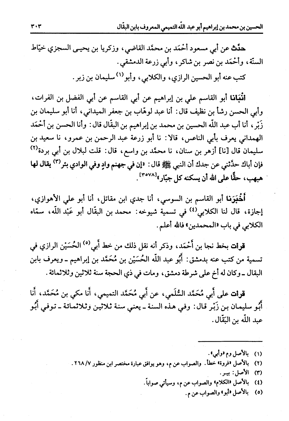 حدث عن أبي مسعود أحمد بن محمد القاضي وزكريا بن يحيى السجزي خياط السنة وأحمد بن نصر بن شاكر وأبي زرعة الدمشقي كتب عنه أبو الحسين الرازي والكلابي وأبو (1) سليمان بن زبر أنبأنا أبو القاسم علي بن إبراهيم عن أبي القاسم عن أبي الفضل بن الفرات وأبي الحسن رشأ بن نظيف قال أنا عبد الوهاب بن جعفر الميداني أنا أبو سليمان بن زبر أنا أب عبد الله بن الحسين بن محمد بن إبراهيم بن البقال قال وأنا الحسن بن أحمد الهمداني يعرف بأبي الناعس قالا نا أبو زرعة عبد الرحمن بن عمرو نا سعيد بن سليمان قال نا أزهر بن سنان نا محمد بن واسع قال قلت لبلال بن أبي بردة (2) فإن اباك حدثني عن جدك أن النبي (صلى الله عليه وسلم) قال إن في جهنم واد وفي الواد بئر (3) يقال لها هبهب حقا على الله أن يسكنه كل جبار أخبرنا أبو القاسم بن السوسي أنا جدي ابن مقاتل أنا أبو علي الأهوازي إجازة قال لنا الكلابي (4) في تسمية شيوخه محمد بن البقال أبو عبد الله سماه الكلابي في باب المحمدين فالله أعلم قرأت بخط نجا بن أحمد وذكر أنه نقل ذلك من خط أبي (5) الحسين الرازي في تسمية من كتب عنه بدمشق أبو عبد الله الحسين بن محمد بن إبراهيم ويعرف بابن البقال وكان له أخ على شرطة دمشق ومات في ذي الحجة سنة ثلاثين وثلاثمائة قرأت على أبي محمد السلمي عن أبي محمد التميمي أنا مكي بن محمد أنا أبو سليمان بن زبر قال وفي هذه السنة يعني سنة ثلاثين وثلاثمائة توفي أبو عبد الله بن البقال
