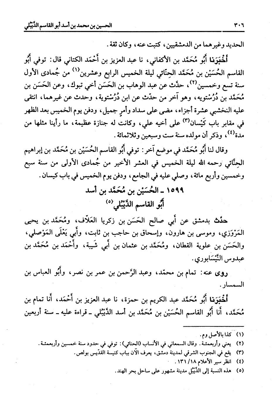 1599 - الحسين بن محمد بن أسد أبو القاسم الديبلي (5) حدث بدمشق عن أبي صالح الحسن بن زكريا العلاف ومحمد بن يحيى المروزي وموسى بن هارون وإسحاق بن حاجب بن ثابت وأبي يعلى الموصلي والحسن بن علوية القطان ومحمد بن عثمان بن أبي شيبة وأحمد بن محمد بن عبدوس النيسابوري روى عنه تمام بن محمد وعبد الرحمن بن عمر بن نصر وأبو العباس بن السمسار أخبرنا أبو محمد عبد الكريم بن حمزة نا عبد العزيز بن أحمد أنا تمام بن محمد أنا أبو القاسم الحسين بن محمد بن أسد الديبلي قراءة عليه سنة أربعين