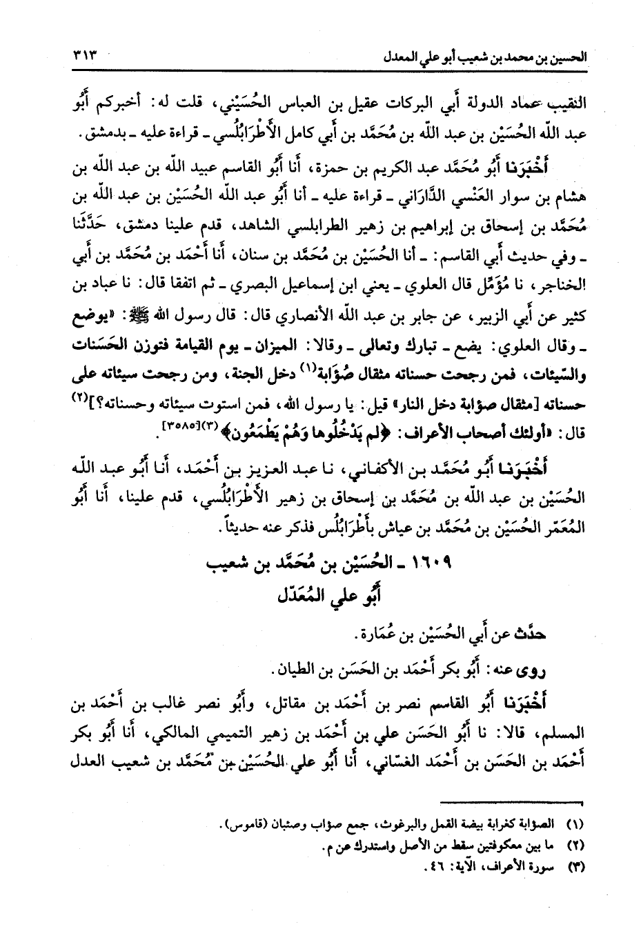 النقيب عماد الدولة أبي البركات عقيل بن العباس الحسيني قلت له أخبركم أبو عبد الله الحسين بن عبد الله بن محمد بن أبي كامل الأطرابلسي قراءة عليه بدمشق أخبرنا أبو محمد عبد الكريم بن حمزة أنا أبو القاسم عبيد الله بن عبد الله بن هشام بن سوار العنسي الداراني قراءة عليه أنا أبو عبد الله الحسين بن عبد الله بن محمد بن إسحاق بن إبراهيم بن زهير الطرابلسي الشاهد قدم علينا دمشق حدثنا وفي حديث أبي القاسم أنا الحسين بن محمد بن سنان أنا أحمد بن محمد بن أبي الخناجر نا مؤمل قال العلوي يعني ابن إسماعيل البصري ثم اتفقا قال نا عباد بن كثير عن أبي الزبير عن جابر بن عبد الله الأنصاري قال قال رسول الله (صلى الله عليه وسلم) يوضع وقال العلوي يضع تبارك وتعالى وقالا الميزان يوم القيامة فتوزن الحسنات والسيئات فمن رجحت حسناته مثقال صؤابة (1) دخل الجنة ومن رجحت سيئاته على حسناته مثقال صؤابة دخل النار قيل يا رسول الله فمن استوت سيئاته وحسناته (2) قال أولئك أصحاب الأعراف " لم يدخلوها وهم يطمعون (3) أخبرنا أبو محمد بن الأكفاني نا عبد العزيز بن أحمد أنا أبو عبد الله الحسين بن عبد الله بن محمد بن إسحاق بن زهير الأطرابلسي قدم علينا أنا أبو المعمر الحسين بن محمد بن عياش بأطرابلس فذكر عنه حديثا