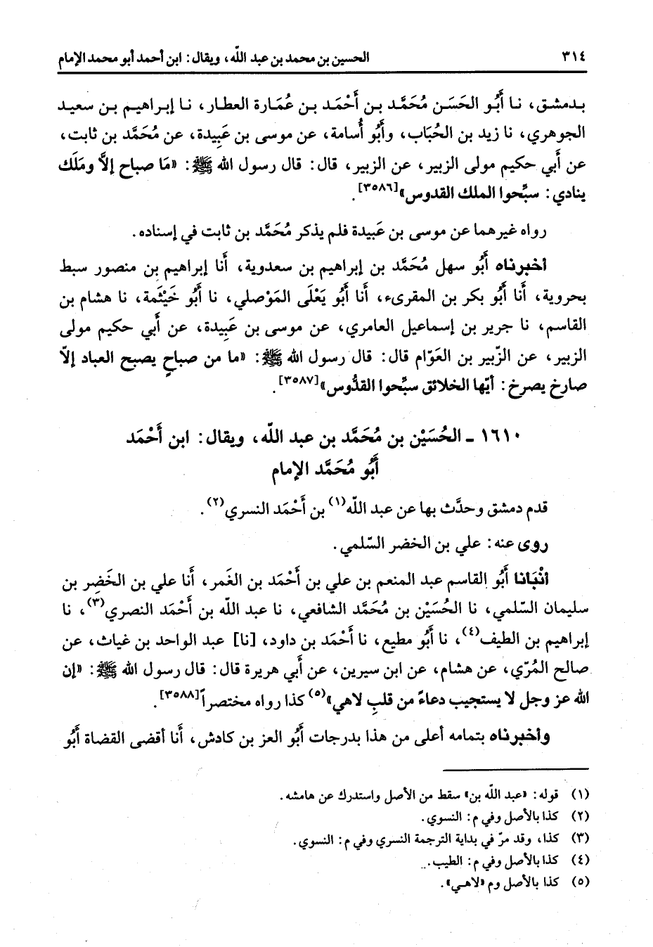 1610 - الحسين بن محمد بن عبد الله ويقال ابن أحمد أبو محمد الإمام قدم دمشق وحدث بها عن عبد الله (1) بن أحمد النسري (2) روى عنه علي بن الخضر السلمي أنبأنا أبو القاسم عبد المنعم بن علي بن أحمد بن الغمر أنا علي بن الخضر بن سليمان السلمي نا الحسين بن محمد الشافعي نا عبد الله بن أحمد النصري (3) نا إبراهيم بن الطيف (4) نا أبو مطيع نا أحمد بن داود نا عبد الواحد بن غياث عن صالح المري عن هشام عن ابن سيرين عن أبي هريرة قال قال رسول الله (صلى الله عليه وسلم) إن الله عز وجل لا يستجيب دعاء من قلب لا هي) (5) كذا رواه مختصرا وأخبرناه بتمامه أعلى من هذا بدرجات أبو العز بن كادش أنا أقضى القضاة أبو