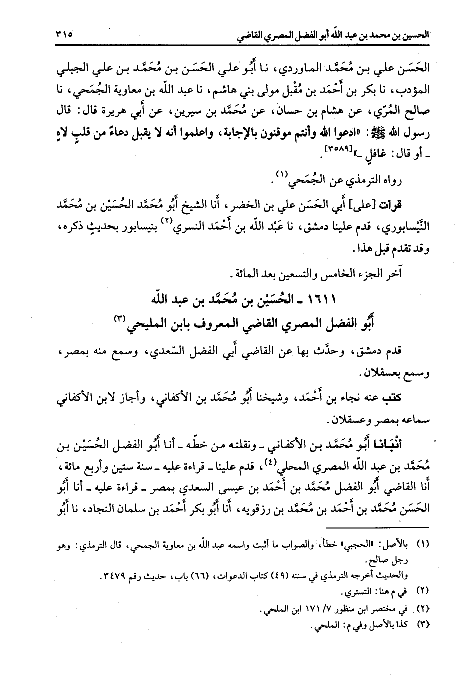1 - الحسين بن محمد بن عبد الله أبو الفضل المصري القاضي المعروف بابن المليحي (3) قدم دمشق وحدث بها عن القاضي أبي الفضل السعدي وسمع منه بمصر وسمع بعسقلان كتب عنه نجاء بن أحمد وشيخنا أبو محمد بن الأكفاني وأجاز لابن الأكفاني سماعه بمصر وعسقلان أنبأنا أبو محمد بن الأكفاني ونقلته من خطه أنا أبو الفضل الحسين بن محمد بن عبد الله المصري المحلي (4) قدم علينا قراءة عليه سنة ستين وأربع مائة أنا القاضي أبو الفضل محمد بن أحمد بن عيسى السعدي بمصر قراءة عليه أنا أبو الحسن محمد بن أحمد بن محمد بن أحمد بن محمد بن رزقويه أنا أبو بكر أحمد بن سلمان النجاد نا أبو