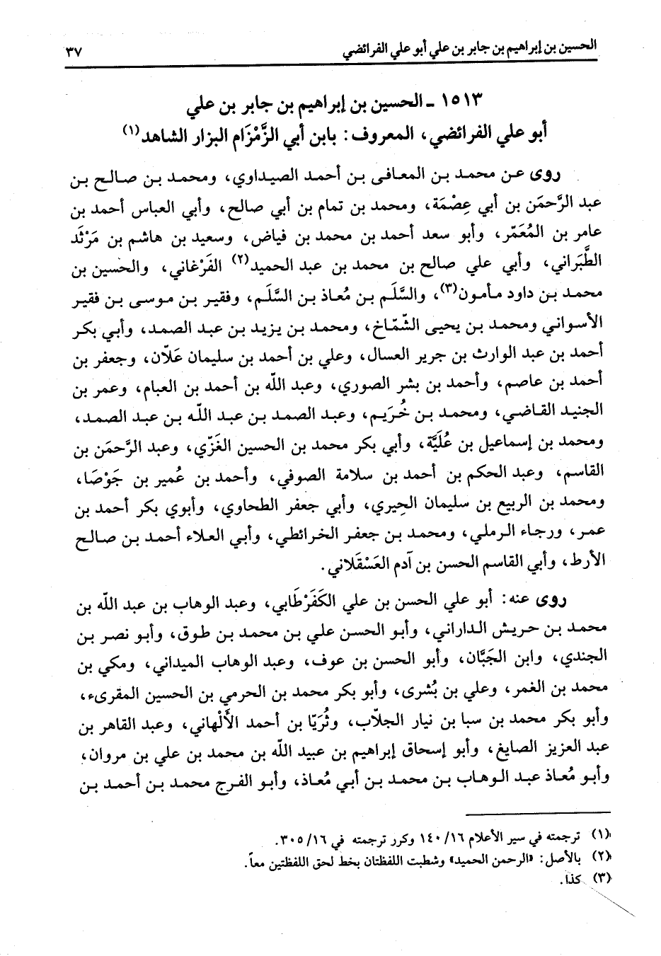 1513 - الحسين بن إبراهيم بن جابر بن علي أبو علي الفرائضي المعروف بابن أبي الزمزام البزار الشاهد (1) روى عن محمد بن المعافى بن أحمد الصيداوي ومحمد بن صالح بن عبد الرحمن بن أبي عصمة ومحمد بن تمام بن أبي صالح وأبي العباس أحمد بن عامر بن المعمر وأبو سعد أحمد بن محمد بن فياض وسعيد بن هاشم بن مرثد الطبراني وأبي علي صالح بن محمد بن عبد الحميد (2) الفرغاني والحسين بن محمد بن داود مأمون (3) والسلم بن معاذ بن السلم وفقير بن موسى بن فقير الأسواني ومحمد بن يحيى الشماخ ومحمد بن يزيد بن عبد الصمد وأبي بكر أحمد بن عبد الوارث بن جرير العسال وعلي بن أحمد بن سليمان علان وجعفر بن أحمد بن عاصم وأحمد بن بشر الصوري وعبد الله بن أحمد العبام وعمر بن الجنيد القاضي ومحمد بن خريم وعبد الصمد بن عبد الله بن عبد الصمد ومحمد بن إسماعيل بن علية وأبي بكر محمد بن الحسين الغزي وعبد الرحمن بن القاسم وعبد الحكم بن أحمد بن سلامة الصوفي وأحمد بن عمير بن جوصا ومحمد بن الربيع بن سليمان الحيري وأبي جعفر الطحاوي وأبوي بكر أحمد بن عمر ورجاء الرملي ومحمد بن جعفر الخرائطي وأبي العلاء أحمد بن صالح الأرط وأبي القاسم الحسن بن آدم العسقلاني روى عنه أبو علي الحسن بن علي الكفرطابي وعبد الوهاب بن عبد الله بن محمد بن حريش الداراني وأبو الحسن علي بن محمد بن طوق وأبو نصر بن الجندي وابن الجبان وأبو الحسن بن عوف وعبد الوهاب الميداني ومكي بن محمد بن الغمر وعلي بن بشرى وأبو بكر محمد بن الحرمي بن الحسين المقرئ وأبو بكر محمد بن سبأ بن نيار الجلاب وثريا بن أحمد الألهاني وعبد القاهر بن عبد العزيز الصايغ وأبو إسحاق إبراهيم بن عبيد الله بن محمد بن علي بن مروان وأبو معاذ عبد الوهاب بن محمد بن أبي معاذ وأبو الفرج محمد بن أحمد بن