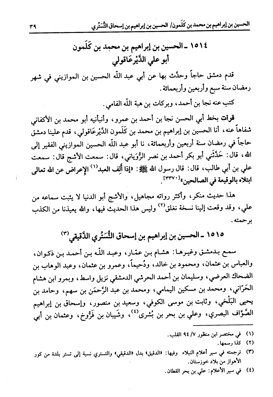 1514 - الحسين بن إبراهيم بن محمد بن كلمون أبو علي الدير عاقولي قدم دمشق حاجا وحدث بها عن أبي عبد الله الحسين بن الموازيني في شهر رمضان سنة سبع وأربعين وأربعمائة كتب عنه نجا بن أحمد وبركات بن هبة الله الفامي قرأت بخط أبي الحسن نجا بن أحمد بن عمرو وأنبأنيه أبو محمد بن الأكفاني شفاها عنه أنا الحسين بن إبراهيم بن محمد بن كلمون الدير عاقولي قدم علينا دمشق حاجا في رمضان سنة أربعين وأربعمائة نا أبو عبد الله الحسين الموازيني الفقير إلى الله قال حدثني أبو بكر أحمد بن نصر الروياني قال سمعت الأشج قال سمعت علي بن أبي طالب قال قال رسول الله (صلى الله عليه وسلم) إذا ألف العبد (1) الإعراض عن الله تعالى ابتلاه بالوقيعة في الصالحين هذا حديث منكر وأكثر رواته مجاهيل والأشج أبو الدنيا لا يثبت سماعه من علي وقد وقعت إلينا نسخة نغلق (2) وليس هذا الحديث فيها والله يعيذنا من الكذب برحمته