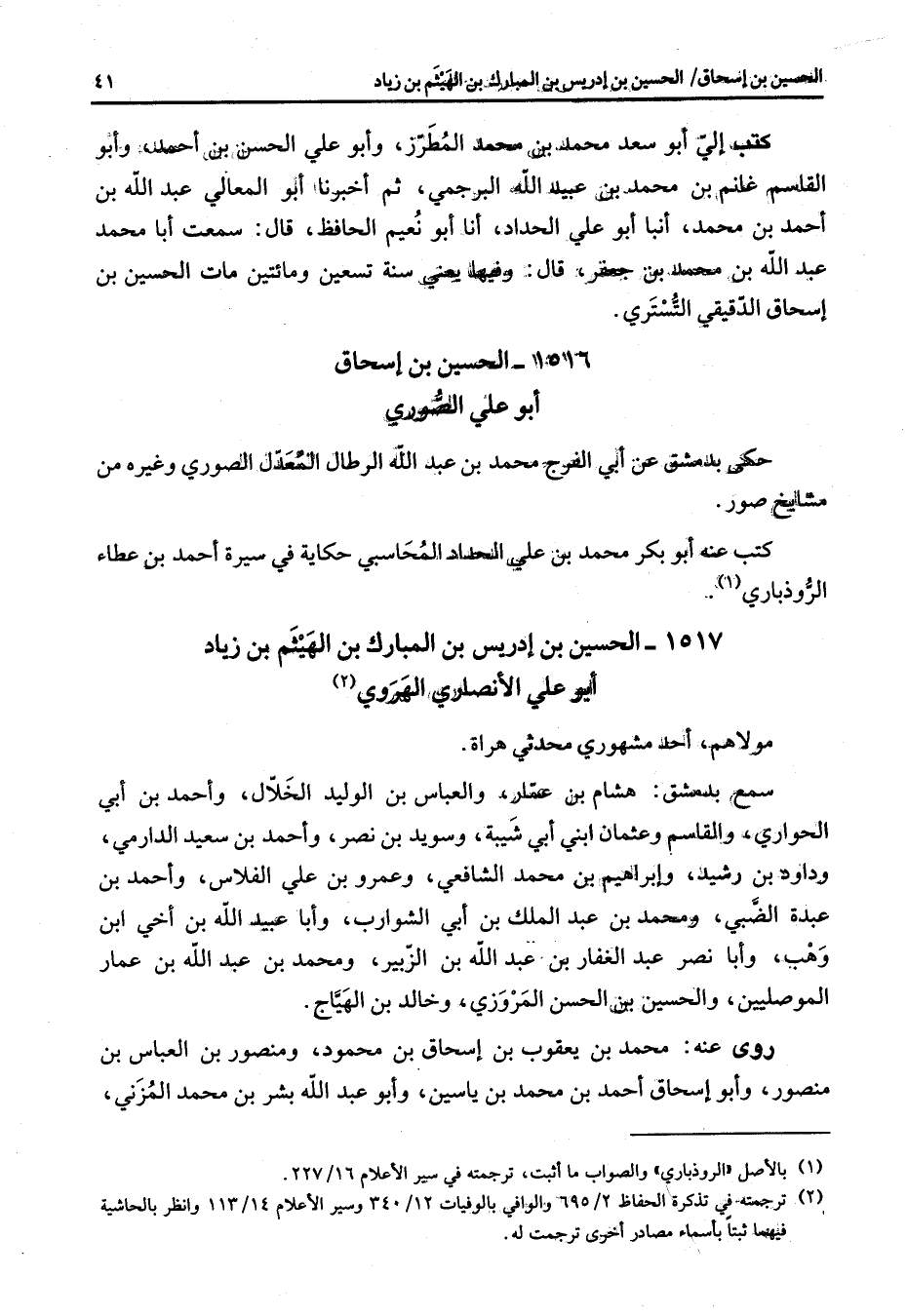 1516 - الحسين بن إسحاق أبو علي الصوري حكي بدمشق عن أبي الفرج محمد بن عبد الله الرطال المعدل الصوري وغيره من مشايخ صور كتب عنه أبو بكر محمد بن علي الحداد المحاسبي حكاية في سيرة أحمد بن عطاء الروذباري (1) 1517 - الحسين بن إدريس بن المبارك بن الهيثم بن زياد أبو علي الأنصاري الهروي (2) مولاهم أحمد مشهوري محدثي هراة