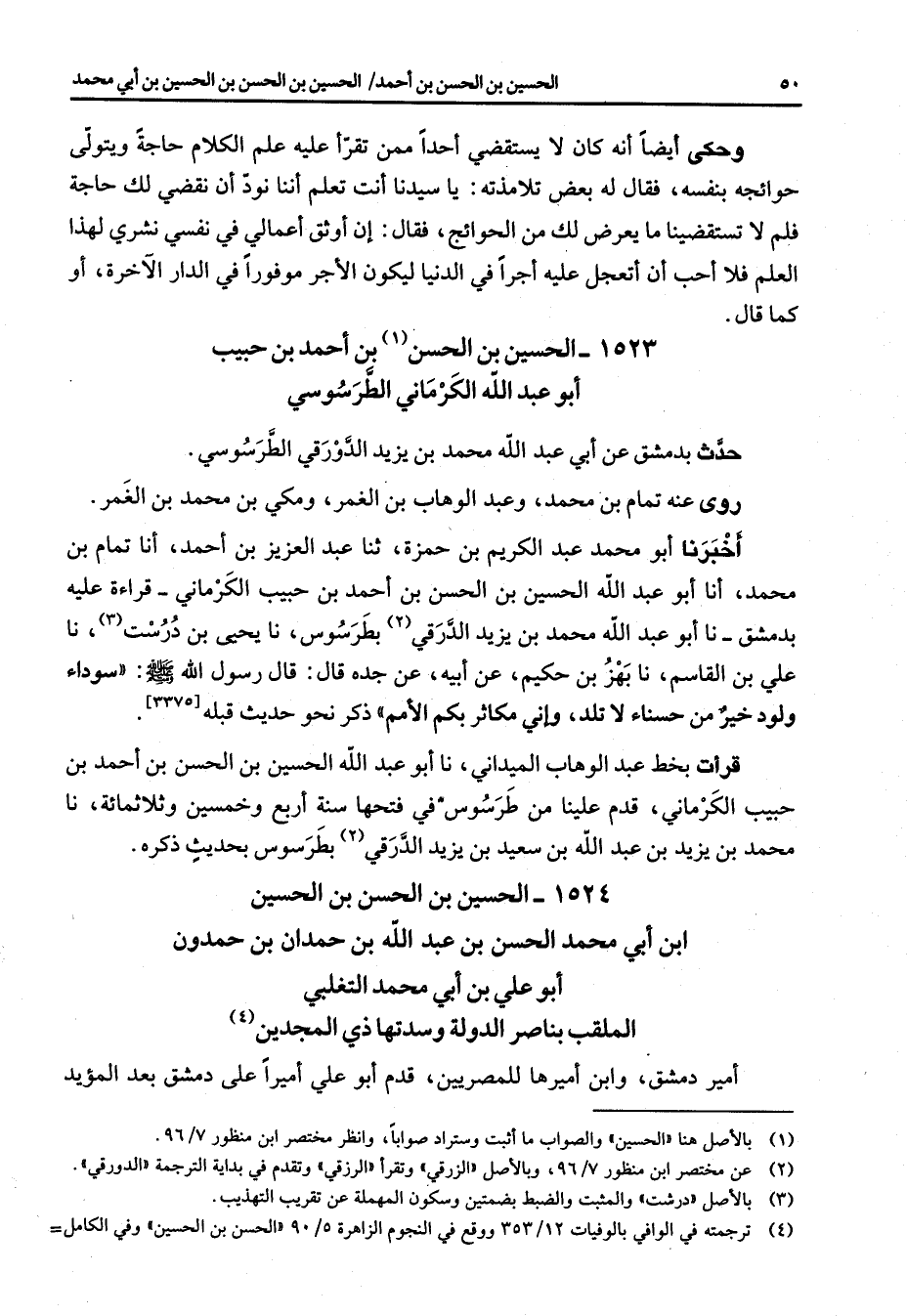 1523 - الحسين بن الحسن (1) بن أحمد بن حبيب أبو عبد الله الكرماني الطرسوسي حدث بدمشق عن أبي عبد الله محمد بن يزيد الدورقي الطرسوسي روى عنه تمام بن محمد وعبد الوهاب بن الغمر ومكي بن محمد بن الغمر أخبرنا أبو محمد عبد الكريم بن حمزة ثنا عبد العزيز بن أحمد أنا تمام بن محمد أنا أبو عبد الله بن الحسين بن الحسن بن أحمد بن حبيب الكرماني قراءة عليه بدمشق نا أبو عبد الله محمد بن يزيد الدرقي (2) بطرسوس نا يحيى بن درست (3) نا علي بن القاسم نا بهز بن حكيم عن أبيه عن جده قال قال رسول الله (صلى الله عليه وسلم) سوداء ولود خير من حسناء لا تلد وإني مكاثر بكم الأمم ذكر نحو حديث قبله قرأت بخط عبد الوهاب الميداني نا أبو عبد الله الحسين بن الحسن بن أحمد بن حبيب الكرماني قدم علينا من طرسوس في فتحها سنة أربع وخمسين وثلاثمائة نا محمد بن يزيد بن عبد الله بن سعيد بن يزيد الدرقي (2) بطرسوس بحديث ذكره