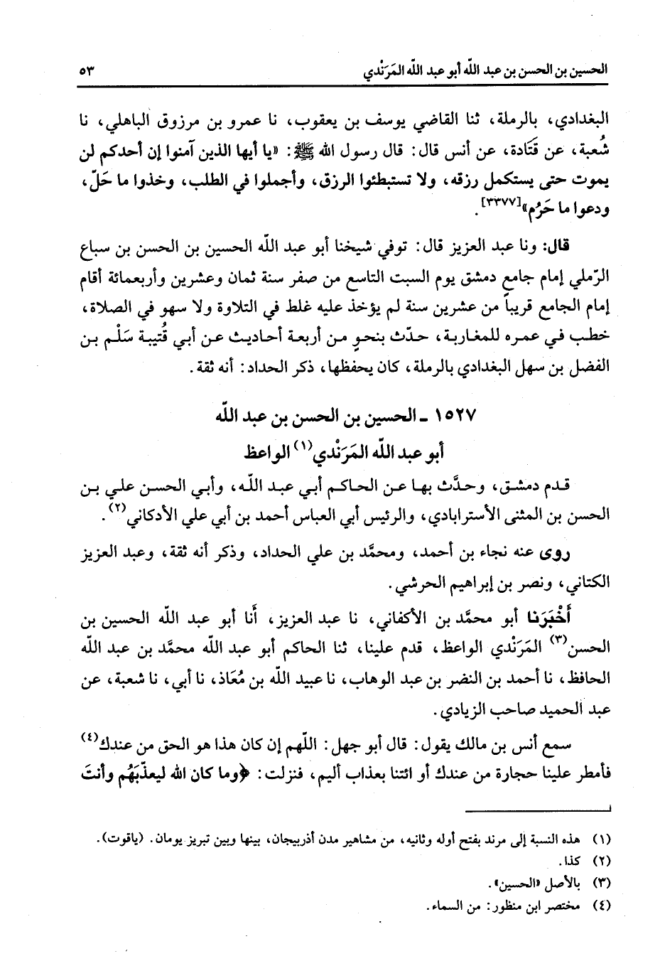 1527 - الحسين بن الحسن بن عبد الله أبو عبد الله المرندي (1) الواعظ قدم دمشق وحدث بها عن الحاكم أبي عبد الله وأبي الحسن علي بن الحسن بن المثنى الأستر ابادي والرئيس أبي العباس أحمد بن أبي علي الأدكاني (2)