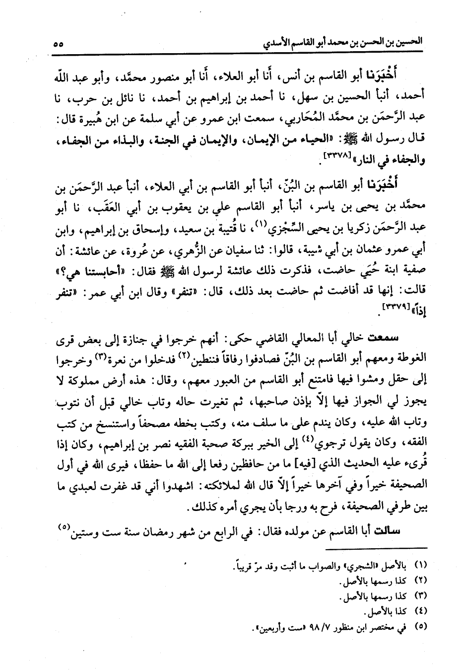 أخبرنا أبو القاسم بن أنس أنا أبو العلاء أنا أبو منصور محمد وأبو عبد الله أحمد أنبأ الحسين بن سهل نا أحمد بن إبراهيم بن أحمد نا نائل بن حرب نا عبد الرحمن بن محمد المحاربي سمعت ابن عمرو عن أبي سلمة عن ابن هبيرة قال قال رسول الله (صلى الله عليه وسلم) الحياء من الإيمان والإيمان في الجنة والبذاء من الجفاء والجفاء في النار أخبرنا أبو القاسم بن البن أنبأ أبو القاسم بن أبي العلاء أنبأ عبد الرحمن بن محمد بن يحيى بن ياسر أنبأ أبو القاسم علي بن يعقوب بن أبي العقب نا أبو عبد الرحمن زكريا بن يحيى السجزي (1) نا قتيبة بن سعيد وإسحاق بن إبراهيم وابن أبي عمرو عثمان بن أبي شيبة قالوا ثنا سفيان عن الزهر عن عروة عن عائشة أن صفية ابنة حيي حاضت فذكرت ذلك عائشة لرسول الله (صلى الله عليه وسلم) فقال أحابستنا هي؟) قالت إنها قد أفاضت ثم حاضت بعد ذلك قال تنفر وقال ابن أبي عمر تنفر إذا سمعت خالي أبو المعالي القاضي حكى أنهم خرجوا في جنازة إلى بعض قرى الغوطة ومعهم أبو القاسم بن البن فصادفوا رفاقا فننطين (2) فدخلوا من نعره (3) وخرجوا إلى حقل ومشوا فيها فامتنع أبو القاسم من العبور معهم وقال هذه أرض مملوكة لا يجوز لي الجواز فيها إلا بإذن صاحبها ثم تغيرت حاله وتاب خالي قبل أن نتوب وتاب الله عليه وكان يندم على ما سلف منه وكتب بخطه مصحفا واستنسخ من كتب الفقه وكان يقول ترجوي (4) إلى الخير ببركة صحبة الفقيه نصر بن إبراهيم وكان إذا قرئ عليه الحديث الذي فيه ما من حافظين رفعا إلى الله ما حفظا فيرى الله في أول الصحيفة خيرا وفي آخرها خيرا إلا قال الله لملائكته اشهدوا أني قد غفرت لعبدي ما بين طرفي الصحيفة فرح به ورجا بأن يجري أمره كذلك سألت أبا القاسم عن مولده فقال في الرابع من شهر رمضان سنة ست وستين (5)