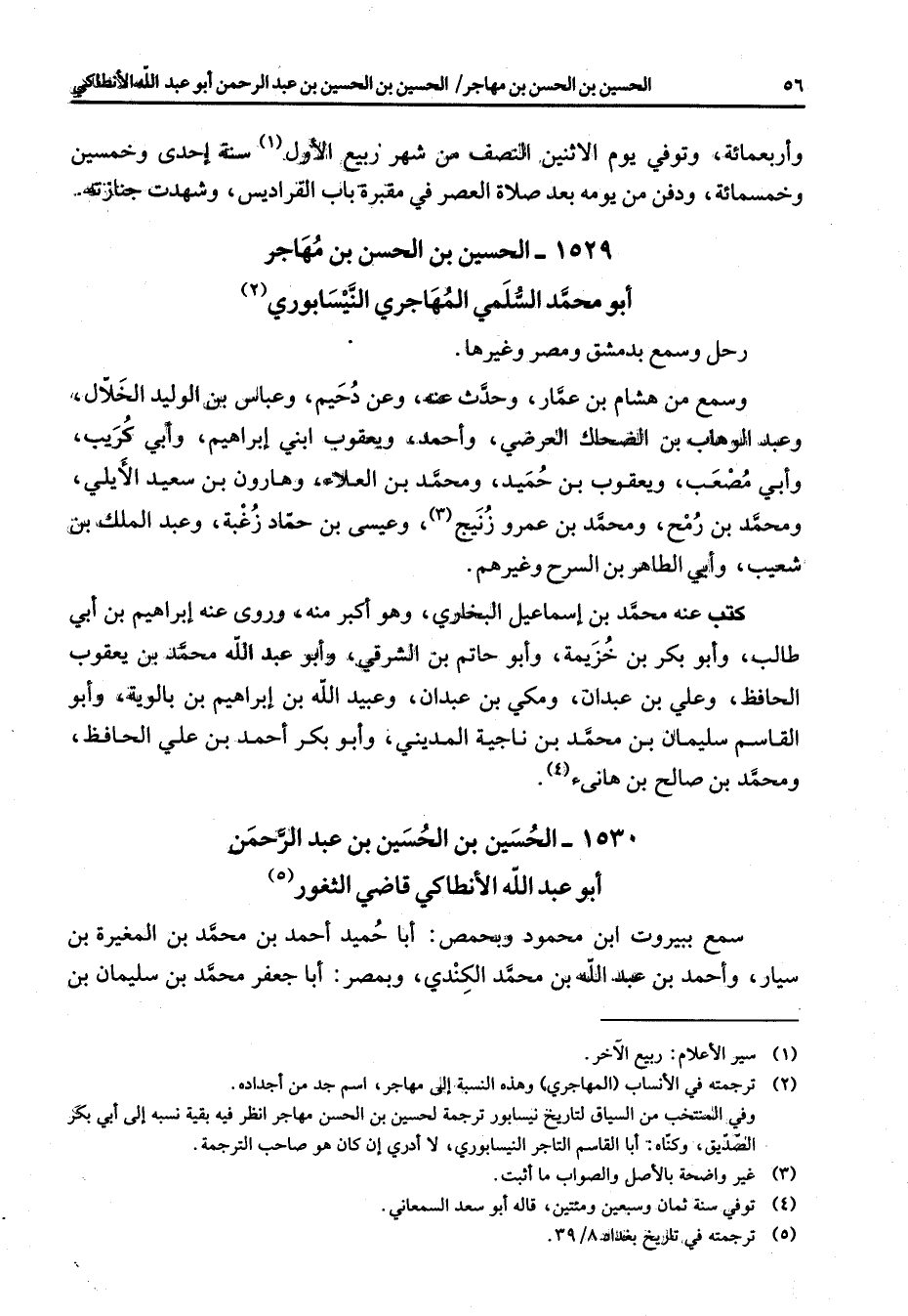 1530 - الحسين بن الحسين بن عبد الرحمن أبو عبد الله الأنطاكي قاضي الثغور (5) سمع ببيروت ابن محمود وبحمص أبا حميد أحمد بن محمد بن المغيرة بن سيار وأحمد بن عبد الله بن محمد الكندي وبمصر أبا جعفر محمد بن سليمان بن