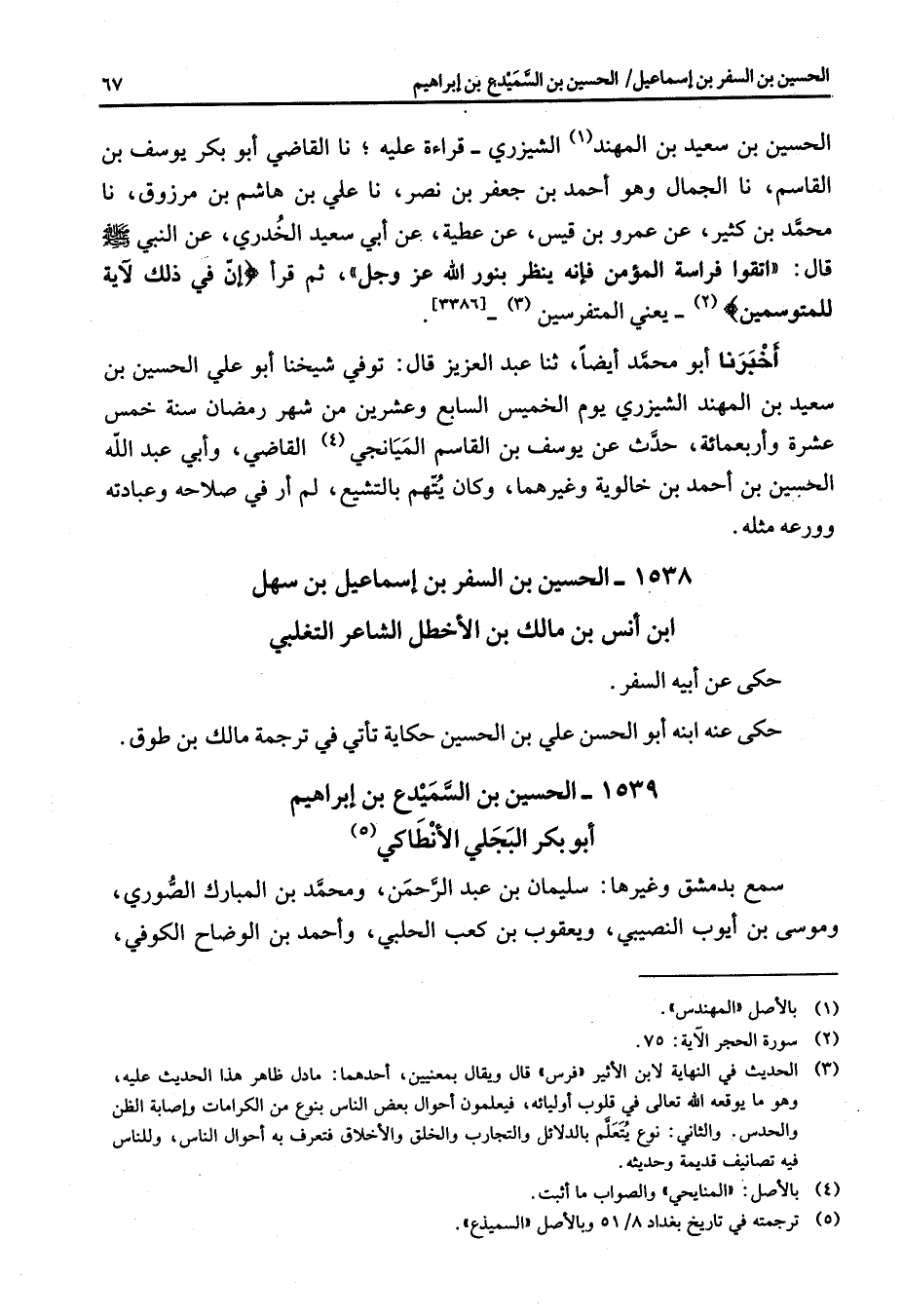 الحسين بن سعيد بن المهند (1) الشيزري قراءة عليه نا القاضي أبو بكر يوسف بن القاسم نا الجمال وهو أحمد بن جعفر بن نصر نا علي بن هاشم بن مرزوق نا محمد بن كثير عن عمرو بن قيس عن عطية عن أبي سعيد الخدري عن النبي (صلى الله عليه وسلم) قال اتقوا فراسة المؤمن فإنه ينظر بنور الله عز وجل ثم قرأ " إن في ذلك لآية للمتوسمين " (2) - يعني المتفرسين (3) أخبرنا أبو محمد أيضا ثنا عبد العزيز قال توفي شيخنا أبو علي الحسين بن سعيد بن الهند الشيزري يوم الخميس السابع وعشرين من شهر رمضان سنة خمس عشرة وأربعمائة حدث عن يوسف بن القاسم الميانجي (4) القاضي وأبي عبد الله الحسين بن أحمد بن خالوية وغيرهما وكان يتهم بالتشيع لم أر في صلاحه وعبادته وورعه مثله