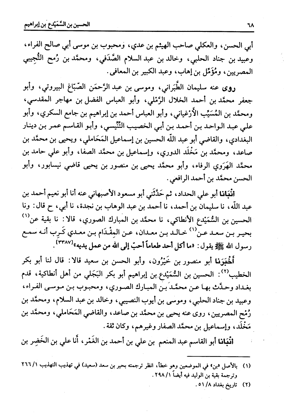 أبي الحسن والعكلي صاحب الهيثم بن عدي ومحبوب بن موسى أبي صالح الفراء وعبيد بن جناد الحلبي وخالد بن عبد السلام الصدفي ومحمد بن رمح التجيبي المصريين ومؤمل بن إهاب وعبد الكبير بن المعافى روى عنه سليمان الطبراني وموسى بن عبد الرحمن الصباغ البيروتي وأبو جعفر محمد بن أحمد الخلال الرملي وأبو العباس الفضل بن مهاجر المقدسي ومحمد بن المسيب الأرغياني وأبو العباس أحمد بن إبراهيم بن جامع السكري وأبو علي عبد الواحد بن أحمد بن أبي الخصيب التنيسي وأبو القاسم عمر بن دينار البغدادي والقاضي أبو عبد الله الحسين بن إسماعيل المحاملي ويحيى بن محمد بن صاعد ومحمد بن مخلد الدوري وإسماعيل بن محمد الصفا وأبو علي حامد بن محمد الهروي الرفاء وأبو محمد يحيى بن منصور بن يحيى قاضي نيسابور وأبو الحسن محمد بن أحمد الرافعي أنبأنا أبو علي الحداد ثم حدثني أبو مسعود الأصبهاني عنه أنا أبو نعيم أحمد بن عبد الله نا سليمان بن أحمد نا أحمد بن عبد الوهاب بن نجدة نا أبي قال ونا الحسين بن السميدع الأنطاكي نا محمد بن المبارك الصوري قالا نا بقية عن (1) بحير بن سعد عن (1) خالد بن معدان عن المقدام بن معدي كرب أنه سمع رسول الله (صلى الله عليه وسلم) يقول ما أكل أحد طعاما أحب إلى الله من عمل يديه) أخبرنا أبو منصور بن خيرون وأبو الحسن بن سعيد قالا قال لنا أبو بكر الخطيب (2) الحسين بن السميدع بن إبراهيم أبو بكر البجلي من أهل أنطاكية قدم بغداد وحدث بها عن محمد بن المبارك الصوري ومحبوب بن موسى الفراء وعبيد بن جناد الحلبي وموسى بن أيوب النصيبي وخالد بن عبد السلام ومحمد بن رمح المصريين روى عنه يحيى بن محمد بن صاعد والقاضي المحاملي ومحمد بن مخلد وإسماعيل بن محمد الصفار وغيرهم وكان ثقة أنبأنا أبو القاسم عبد المنعم بن علي بن أحمد بن الغمر أنا علي بن الخضر بن