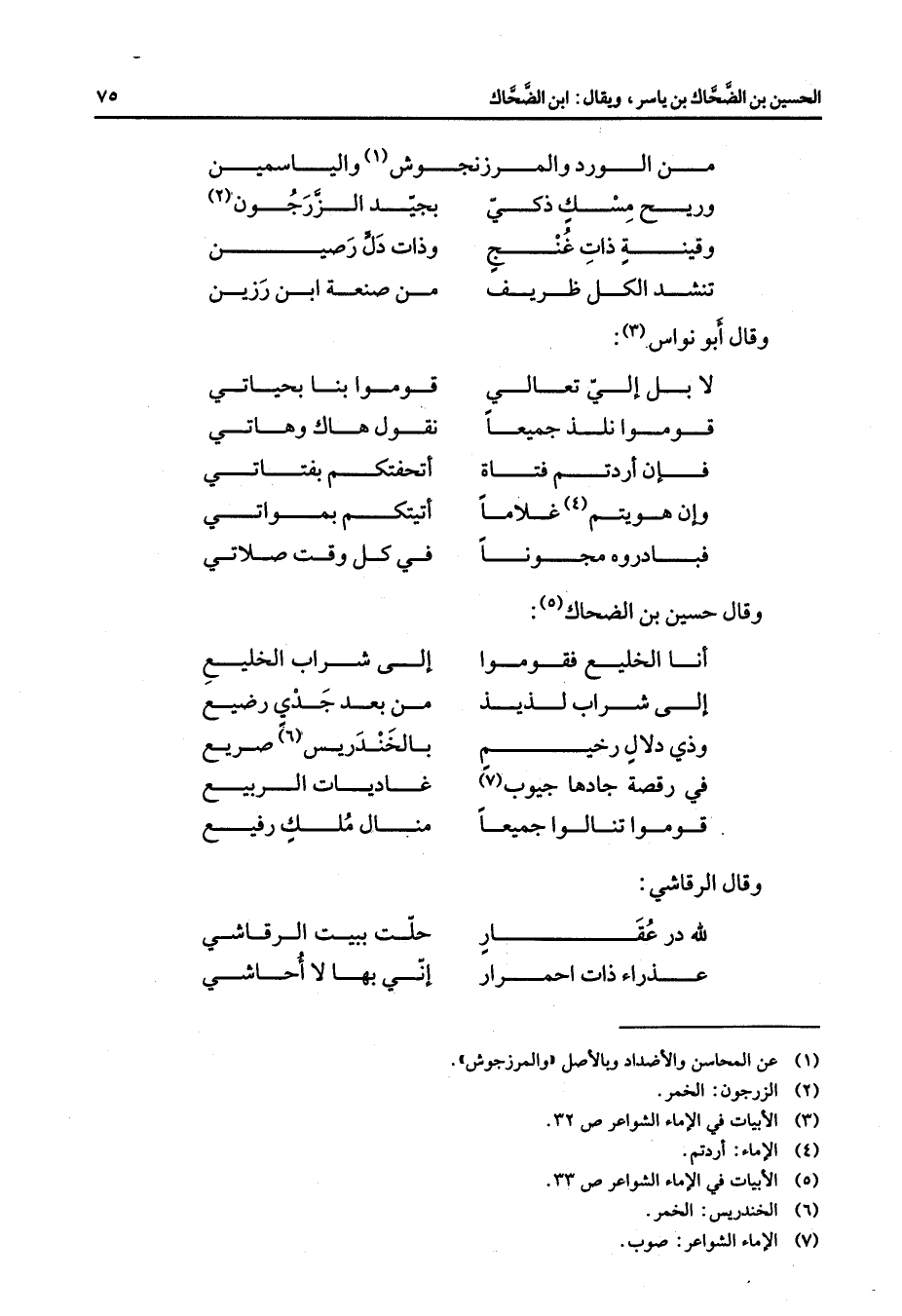 من الورد والمرزنجوش (1) والياسمين وريح مسك ذكي * بجيد الزرجون (2) وقينة ذات غنج * وذات دل رصين تنشد الكل ظريف * من صنعة ابن رزين وقال أبو نواس (3) : لا بل إلي تعالي * قوموا بنا بحياتي قوموا نلذ جميعا * نقول هاك وهاتي فإن أردتم فتاة * أتحفتكم بفتاتي وإن هويتم (4) غلاما * أتيتكم بمواتي فبادروه مجونا * في كل وقت صلاتي * وقال حسين بن الضحاك * أنا الخليع فقوموا * إلى شراب الخليع إلى شراب لذيذ * من بعد جدي رضيع وذي دلال رخيم * بالخندريس (6) صريع في رقصة جادها جيوب (7) * غاديات الربيع قوموا تنالوا جميعا * منال ملك رفيع وقال الرقاشي * لله در عقار * حلت ببيت الرقاشي عذراء ذات احمرار * إني بها لا أحاشي