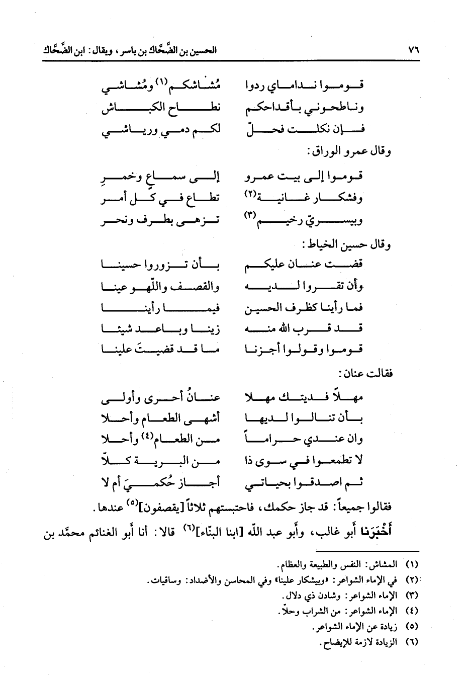 قوموا نداماي ردوا * مشاشكم (1) ومشاشي وناطحوني بأقداحكم * نطاح الكباش فإن نكلت فحل * لكم دمي ورياشي وقال عمرو الوراق: قوموا إلى بيت عمرو * إلى سماع وخمر وفشكار غانية (2) تطاع في كل أمر وبيسري رخيم (3) تزهى بطرف ونحر وقال حسين الخياط قضت عنان عليكم بأن تزوروا حسينا وأن تقروا لديه * والقصف واللهو عينا فما رأينا كظرف الحسين * فيما رأينا قد قرب الله منه * زينا وباعد شيئا قوموا وقولوا أجزنا * ما قد قضيت علينا فقالت عنان: مهلا فديتك مهلا * عنان أحرى وأولى بأن تنالوا لديها * أشهى الطعام وأحلا وان عندي حراما * من الطعام (4) وأحلا لا تطعموا في سوى ذا * من البرية كلا ثم اصدقوا بحياتي * أجاز حكمي أم لا فقالوا جميعا قد جاز حكمك فاحتبستهم ثلاثا يقصفون (5) عندها أخبرنا أبو غالب وأبو عبد الله ابنا البناء (6) قالا أنا أبو الغنائم محمد بن