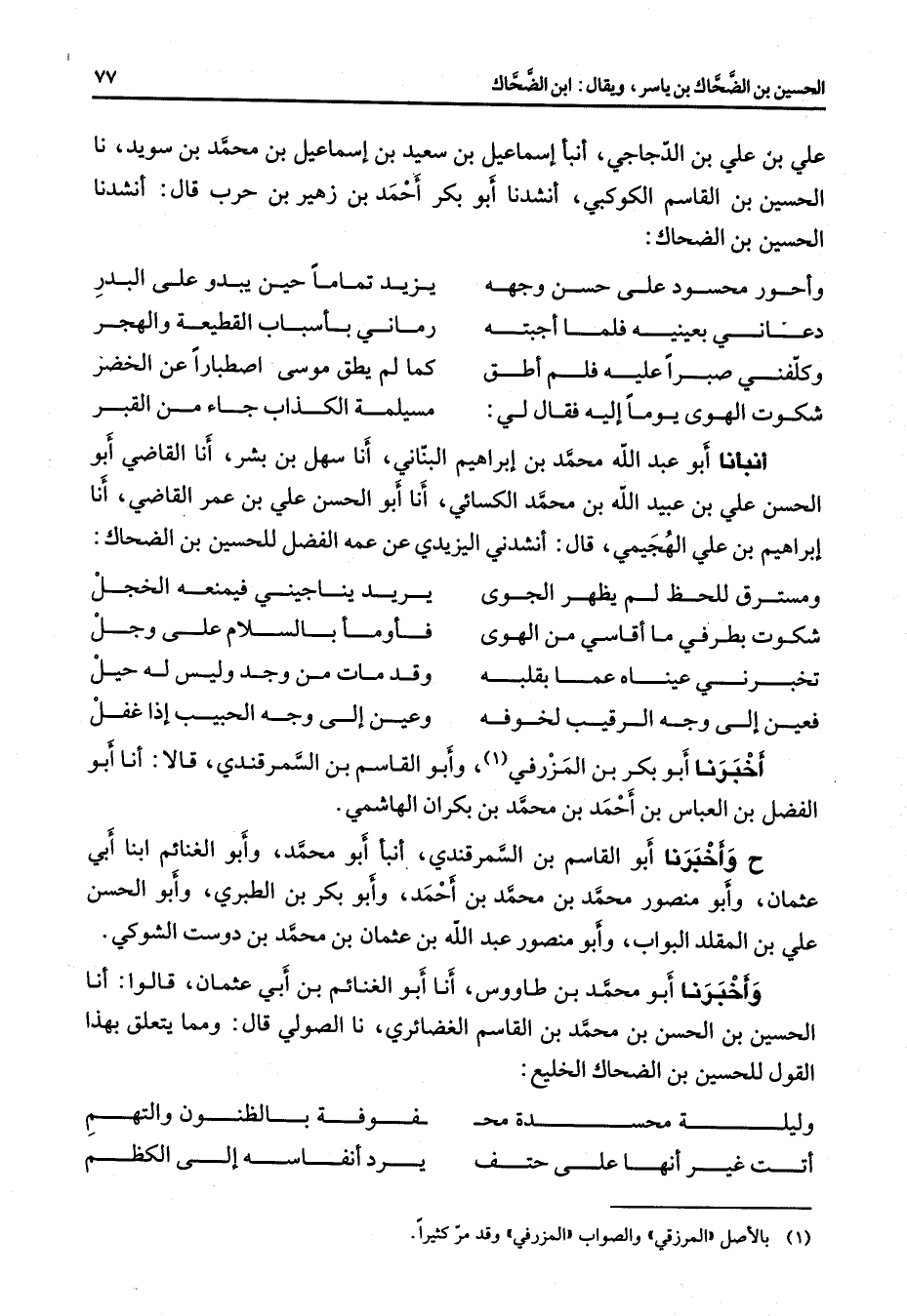 علي بن علي بن الدجاجي أنبأ إسماعيل بن سعيد بن إسماعيل بن محمد بن سويد نا الحسين بن القاسم الكوكبي أنشدنا أبو بكر أحمد بن زهير بن حرب قال أنشدنا الحسين بن الضحاك: وأحور محسود على حسن وجهه * يزيد تماما حين يبدو على البدر دعاني بعينيه فلما أجبته * رماني بأسباب القطيعة والهجر وكلفني صبرا عليه فلم أطق * كما لم يطق موسى اصطبارا عن الخضر شكوت الهوى يوما إليه فقال لي * مسيلمة الكذاب جاء من القبر أنبأنا أبو عبد الله محمد بن إبراهيم البناني أنا سهل بن بشر أنا القاضي أبو الحسن علي بن عبيد الله بن محمد الكسائي أنا أبو الحسن علي بن عمر القاضي أنا إبراهيم بن علي الهجيمي قال أنشدني اليزيدي عن عمه الفضل للحسين بن الضحاك ومسترق للحظ لم يظهر الجوى * يريد يناجيني فيمنعه الخجل شكوت بطرفي ما أقاسي من الهوى * فأومأ بالسلام على وجل تخبرني عيناه عما بقلبه * وقد مات من وجد وليس له حيل فعين إلى وجه الرقيب لخوفه * وعين إلى وجه الحبيب إذا غفل أخبرنا أبو بكر بن المزرقي (1) وأبو القاسم بن السمرقندي قالا أنا أبو الفضل بن العباس بن أحمد بن محمد بن بكران الهاشمي ح وأخبرنا أبو القاسم بن السمرقندي أنبأ أبو محمد وأبو الغنائم ابنا أبي عثمان وأبو منصور محمد بن محمد بن أحمد وأبو بكر بن الطبري وأبو الحسن علي بن المقلد البواب وأبو منصور عبد الله بن عثمان بن محمد بن دوست الشوكي وأخبرنا أبو محمد بن طاووس أنا أبو الغنائم بن أبي عثمان قالوا أنا الحسين بن الحسن بن محمد بن القاسم الغضائري نا الصولي قال ومما يتعلق بهذا القول للحسين بن الضحاك الخليع وليلة محسدة مح * فوفة بالظنون والتهم أتت غير أنها على حتف * يرد أنفاسه إلى الكظم