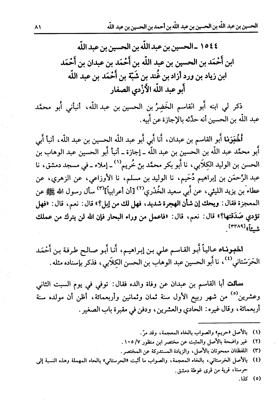 1544 - الحسين بن عبد الله بن الحسين بن عبد الله ابن أحمد بن الحسين بن عبد الله بن أحمد بن عبدان بن أحمد ابن زياد بن ورد أزاد بن غند بن شبة بن أحمد بن عبد الله أبو عبد الله الأزدي الصفار ذكر لي ابنه أبو القاسم الخضر بن الحسين بن عبد الله أنبأني أبو محمد عبد الله بن الحسين أنه حدثه بالإجازة عن أبيه أخبرنا أبو القاسم بن عبدان أنا أبي أبو عبد الله الحسين بن عبد الله أنبأ أبي أبو محمد عبد الله بن الحسين بن عبد الله إجازة أنبأ أبو الحسين عبد الوهاب بن الحسن بن الوليد الكلابي نا أبو بكر محمد بن خريم (1) إملاء في مسجد دمشق نا عبد الرحمن بن إبراهيم دحيم نا الوليد بن مسلم نا الأوزاعي عن الزهري عن عطاء بن يزيد الليثي عن أبي سعد الخدري (2) أن أعرابيا (3) سأل رسول الله (صلى الله عليه وسلم) عن المعجزة فقال ويحك إن شأن الهجرة شديد فهل لك من إبل قال نعم قال فهل تؤدي صدقتها قال نعم قال فاعمل من وراء البحار فإن الله لن يترك من عملك شيئا أخبرناه عاليا أبو القاسم علي بن إبراهيم أنا أبو صالح طرفة بن أحمد الحرستاني (4) نا أبو الحسين عبد الوهاب بن الحسن الكلابي فذكر بإسناده مثله سألت أبا القاسم بن عبدان عن وفاة والده فقال توفي في يوم السبت الثاني وعشرين (5) من شهر ربيع الأول سنة ثمان وثمانين وأربعمائة أظن أن مولده سنة أربعمائة وقال غيره الحادي والعشرين ودفن في مقبرة باب الصغير