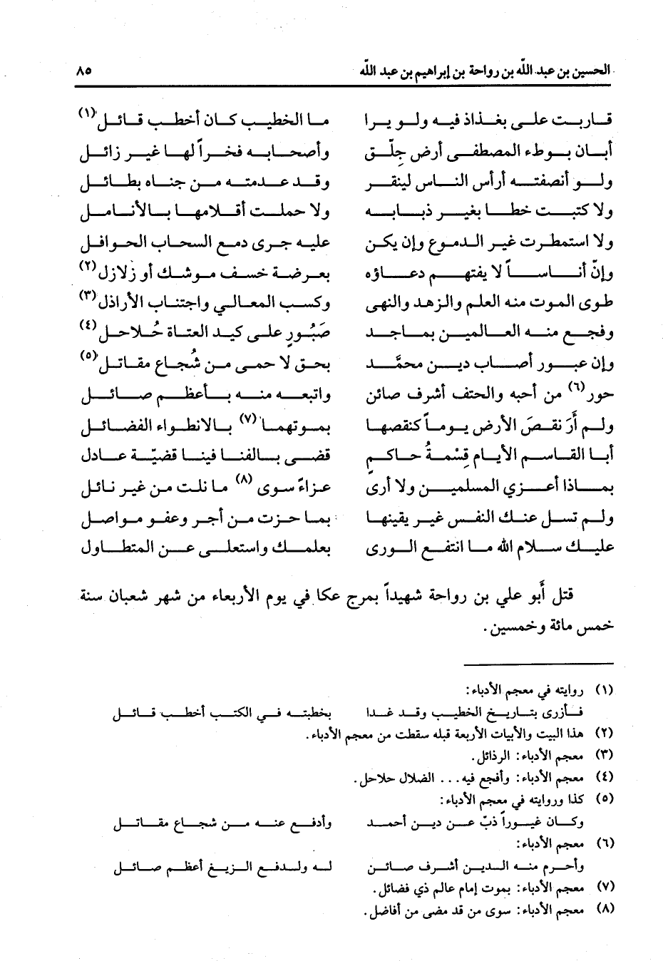 (5) كذا وروايته في معجم الادباء: وكان غيروا ذب عن دين أحمد * وأدفع عنه من شجاع مقاتل (6) معجم الادباء: وأحرم منه الدين أشرف صائن * له ولدفع الزيغ أعظم صائل (7) معجم الادباء: بموت إمام عالم ذي فضائل